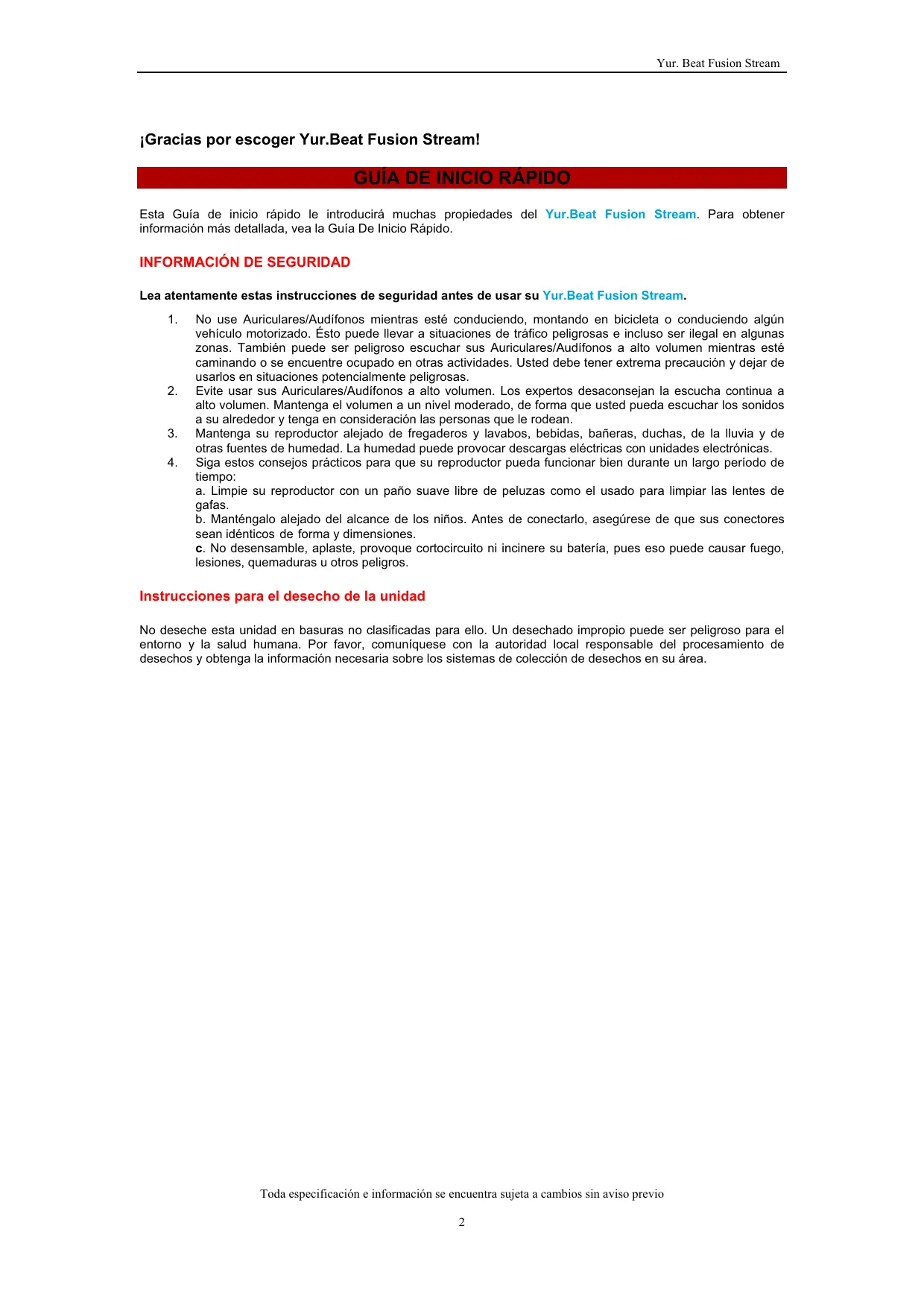 INFORMACIÓN DE SEGURIDAD Lea atentamente estas instrucciones de seguridad antes de usar su Yur.Beat Fusion Stream.