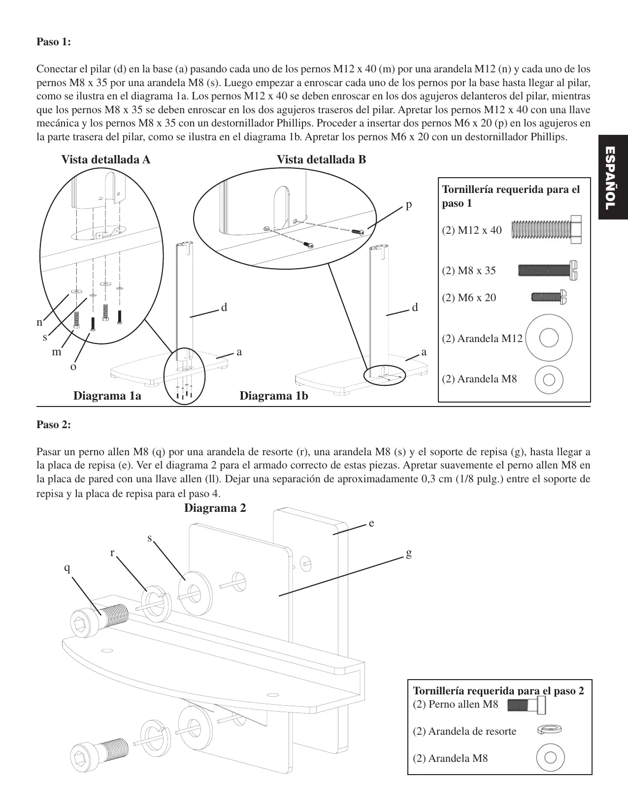 Paso 1: Conectar el pilar (d) en la base (a) pasando cada uno de los pernos M12 x 40 (m) por una arandela M12 (n) y cada uno de los pernos M8 x 35 por una arandela M8 (s). Luego empezar a enroscar cada uno de los pernos por la base hasta llegar al pilar, como se ilustra en el diagrama 1a. Los pernos M12 x 40 se deben enroscar en los dos agujeros delanteros del pilar, mientras que los pernos M8 x 35 se deben enroscar en los dos agujeros traseros del pilar. Apretar los pernos M12 x 40 con una llave mecánica y los pernos M8 x 35 con un destornillador Phillips. Proceder a insertar dos pernos M6 x 20 (p) en los agujeros en la parte trasera del pilar, como se ilustra en el diagrama 1b. Apretar los pernos M6 x 20 con un destornillador Phillips. Vista detallada B Tornillería requerida para el paso 1