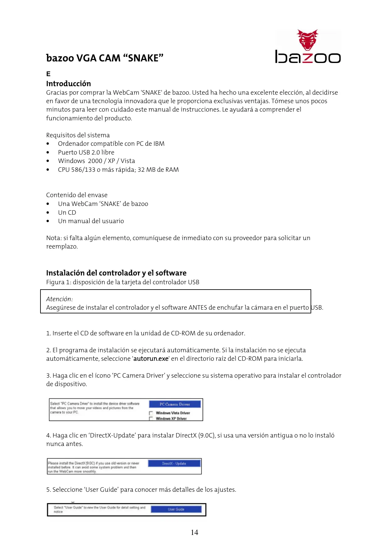 Gracias por comprar la WebCam 'SNAKE' de bazoo. Usted ha hecho una excellente elección, al decidirse en favor de una Tecnología innovadora que le proportionsciona exclusivas ventajas. Tómese uno poco menos para leer con cuidado este manual de instrucciones. Le ayudará a comprender el funciona del producto.