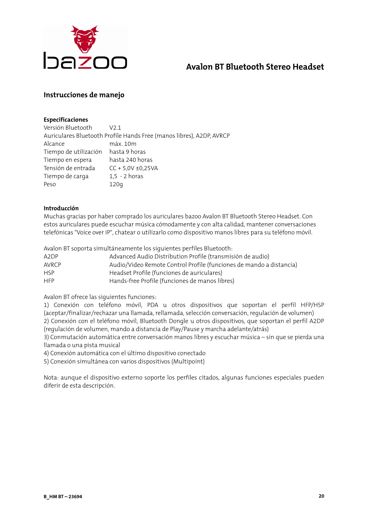 Muchas gratias por haber comprado los auriculas bazoo Avalon BT Bluetooth Stereo Headset. Con ellos auriculas puede eschar música cómodamente y con alta calidad, mantener conversaciones electrónicas "Voice over IP", chatar o utiliser como dispositivo manos libres para su téléphone móvil.