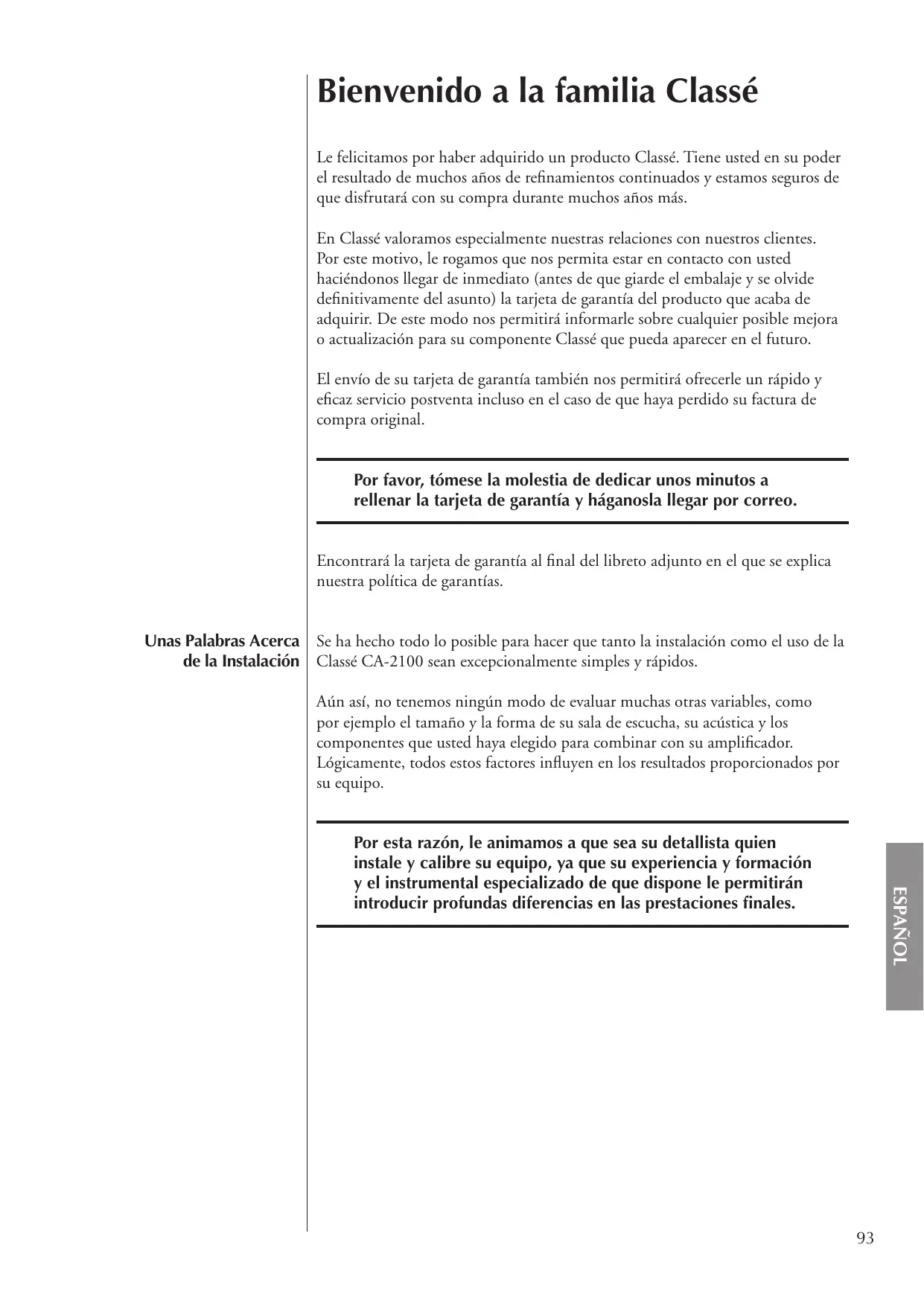 En Classé valoramos especialmente nuestros relaciones con{nuestros clients. Por este motivo, le rogamos que nos permita estar en contacto con usted氢能ndonosOOTAR de inmediato (antes de que giarde el embalaje y se olvide definitivamente del asunto) la tarjeta de garantía del producto que acaba de adquirir. De este modo nos permittedar informarle sobreequalquier possible mayor oactualizacion para su componente Classé que pueda aparecer en el futuro.