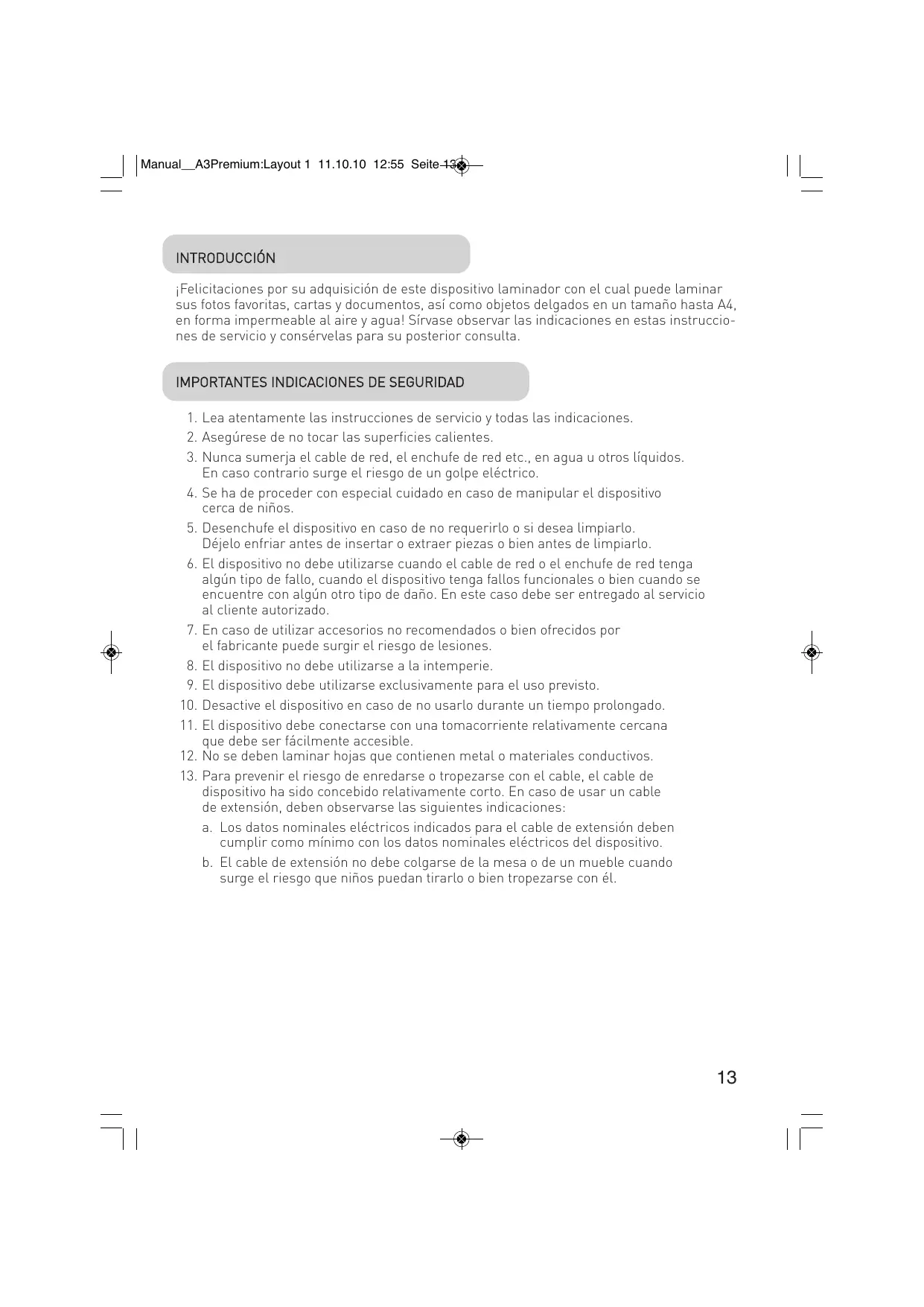 Felicitationes por su adquisacion de este dispositivo laminador con elrialcoulde laminar susotosfavoritas,cartas ydocumentos,asi comoobjectos delgados en un tamanohaA4, en forma impermeable al aire y agua!Sirvase observar lasindicaciones en estas instrucciones de servicey conservelas para su posterior consulta.