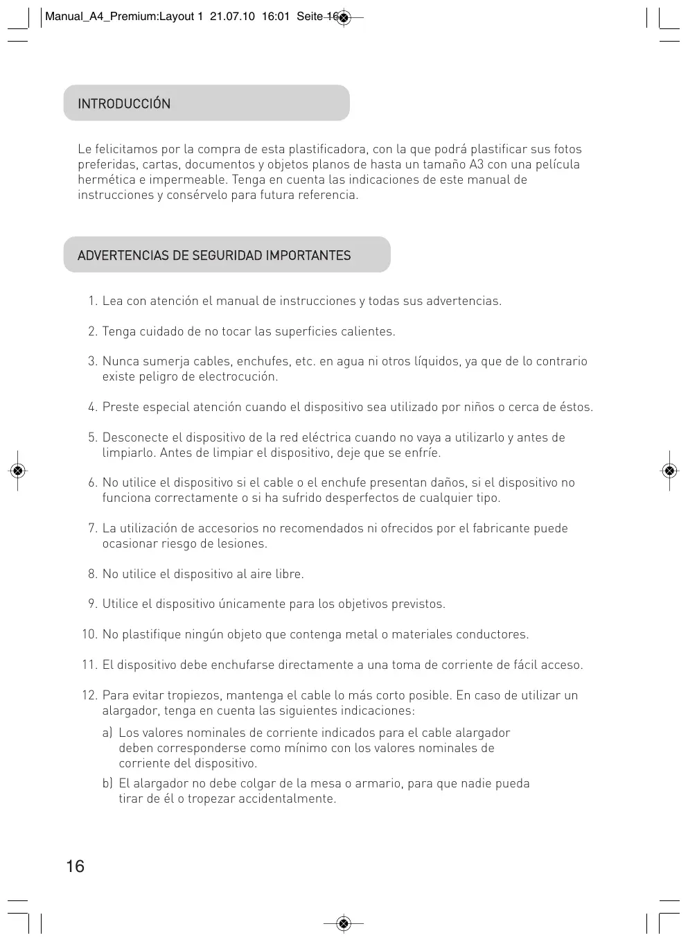Manual_A4_Premium:Layout 1 21.07.10 16:01 Seite 16 INTRODUCCIÓN Le felicitamos por la compra de esta plastificadora, con la que podrá plastificar sus fotos preferidas, cartas, documentos y objetos planos de hasta un tamaño A3 con una película hermética e impermeable. Tenga en cuenta las indicaciones de este manual de instrucciones y consérvelo para futura referencia.