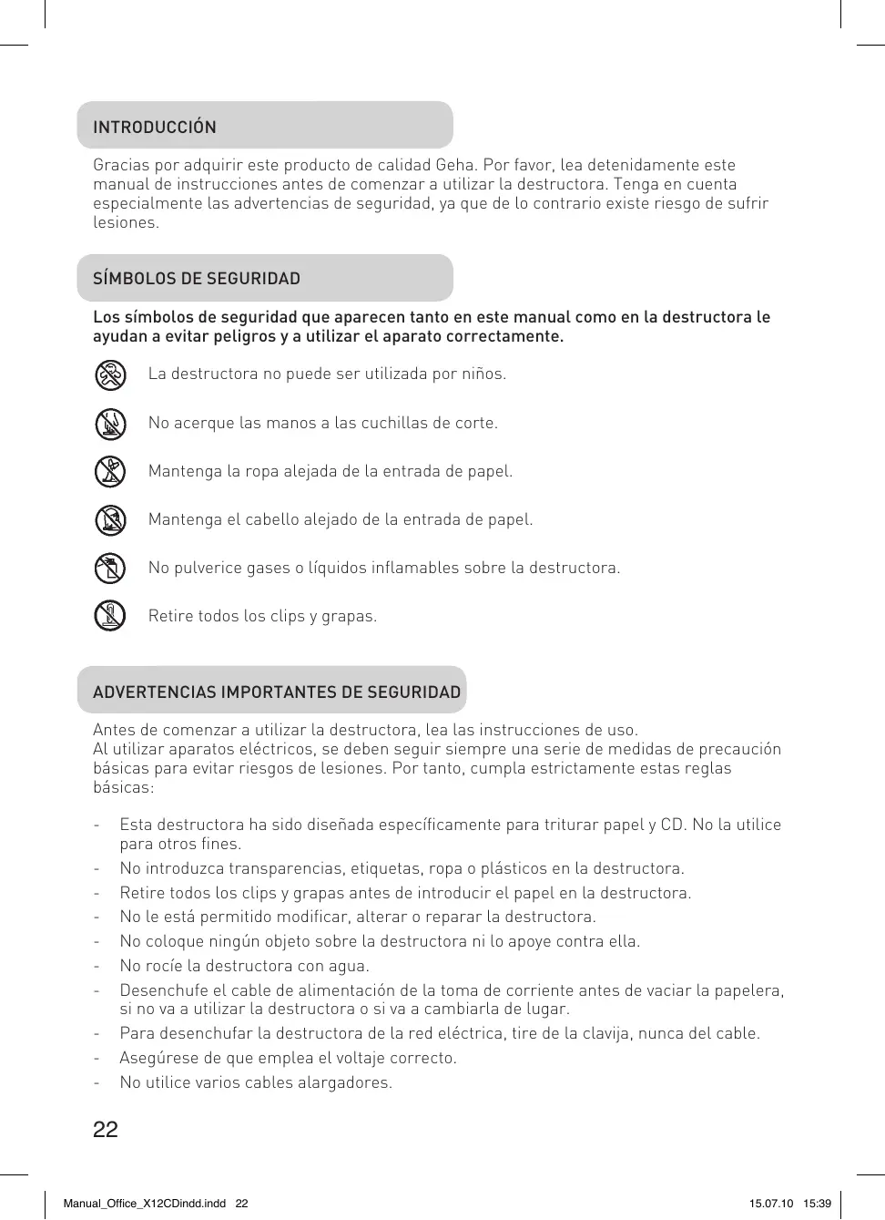 Introducción Gracias por adquirir este producto de calidad Geha. Por favor, lea detenidamente este manual de instrucciones antes de comenzar a utilizar la destructora. Tenga en cuenta especialmente las advertencias de seguridad, ya que de lo contrario existe riesgo de sufrir lesiones. Símbolos de seguridad Los símbolos de seguridad que aparecen tanto en este manual como en la destructora le ayudan a evitar peligros y a utilizar el aparato correctamente.
