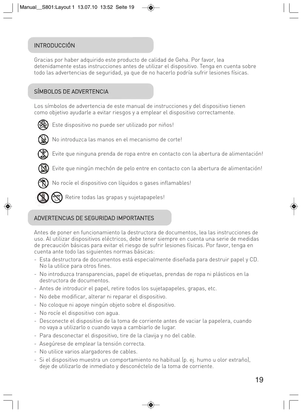 Los símbolos de advertencia de este manual de instrucciones y del dispositivo tienen como objetivo ayudarle a evitar riesgos y a emplear el dispositivo correctamente. Este dispositivo no puede ser utilizado por niños! No introduzca las manos en el mecanismo de corte! Evite que ninguna prenda de ropa entre en contacto con la abertura de alimentación! Evite que ningún mechón de pelo entre en contacto con la abertura de alimentación! No rocíe el dispositivo con líquidos o gases inflamables! Retire todas las grapas y sujetapapeles!