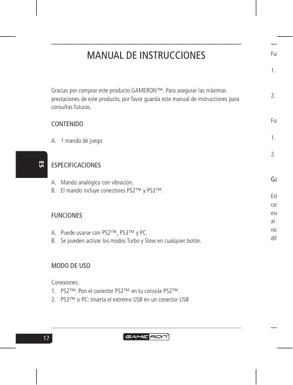 ESPECIFICACIONES A. Mando analógico con vibración. B. El mando incluye conectores PS2™ y PS3™. FUNCIONES A. Puede usarse con PS2™, PS3™ y PC. B. Se pueden activar los modos Turbo y Slow en cualquier botón.