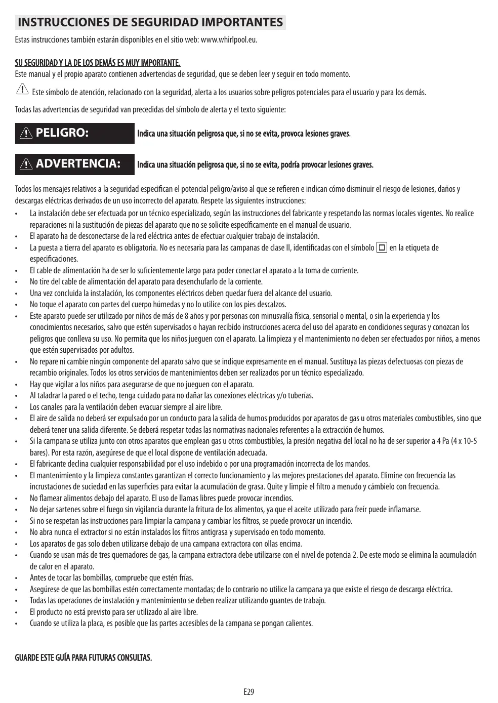 INSTRUCCIONES DE SEGURIDAD IMPORTANTES Estas instrucciones también estarán disponibles en el sitio web: www.whirlpool.eu. SU SEGURIDAD Y LA DE LOS DEMÁS ES MUY IMPORTANTE. Este manual y el propio aparato contienen advertencias de seguridad, que se deben leer y seguir en todo momento. Este símbolo de atención, relacionado con la seguridad, alerta a los usuarios sobre peligros potenciales para el usuario y para los demás. Todas las advertencias de seguridad van precedidas del símbolo de alerta y el texto siguiente: