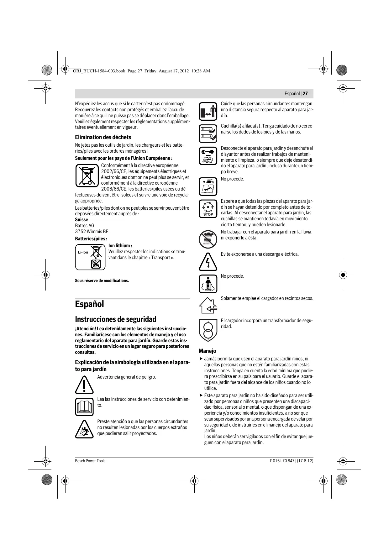4,0 0 – 45 1,0 /II Preste atención al nº de artículo en la placa de características de su aparato para jardín. Las denominaciones comerciales de algunos aparatos para jardín pueden variar. Información sobre ruidos y vibraciones Valores de ruido determinados según 2000/14/CE (altura 1,60 m, separación 1 m). El nivel de presión sonora típico del aparato, determinado con un filtro A, asciende a: Nivel de presión sonora 74 dB(A); nivel de potencia acústica 86 dB(A). Tolerancia K =0,42 dB. Nivel total de vibraciones (suma vectorial de tres direcciones) determinado según EN 60335: Valor de vibraciones generadas ah <2,5 m/s2 , Tolerancia K=1,5 m/s2. Procedimiento para evaluación de la conformidad según anexo VI. Categoría de producto: 32 Centro oficial de inspección citado: SRL, Sudbury, England, Nr. 1088 Expediente técnico (2000/14/CE, 2011/65/UE) en: Bosch Lawn and Garden Ltd., PT-LG/ENS4, Stowmarket, Suffolk IP14 1EY, England Dr. Egbert Schneider Helmut Heinzelmann Senior Vice President Head of Product Engineering Certification Declaración de conformidad Declaramos bajo nuestra responsabilidad, que el producto descrito bajo “Datos técnicos” está en conformidad con las normas o documentos normalizados siguientes: EN 60335, EN 50338 (aparato con acumuladores) y EN 60335 (cargador de acumuladores) de acuerdo con las disposiciones en las directivas 2011/65/UE, 2004/108/CE, 2006/42/CE, 2000/14/CE. 2000/14/CE: Nivel de potencia acústica medido 87 dB(A). F 016 L70 847 | (17.8.12) Robert Bosch GmbH, Power Tools Division D-70745 Leinfelden-Echterdingen