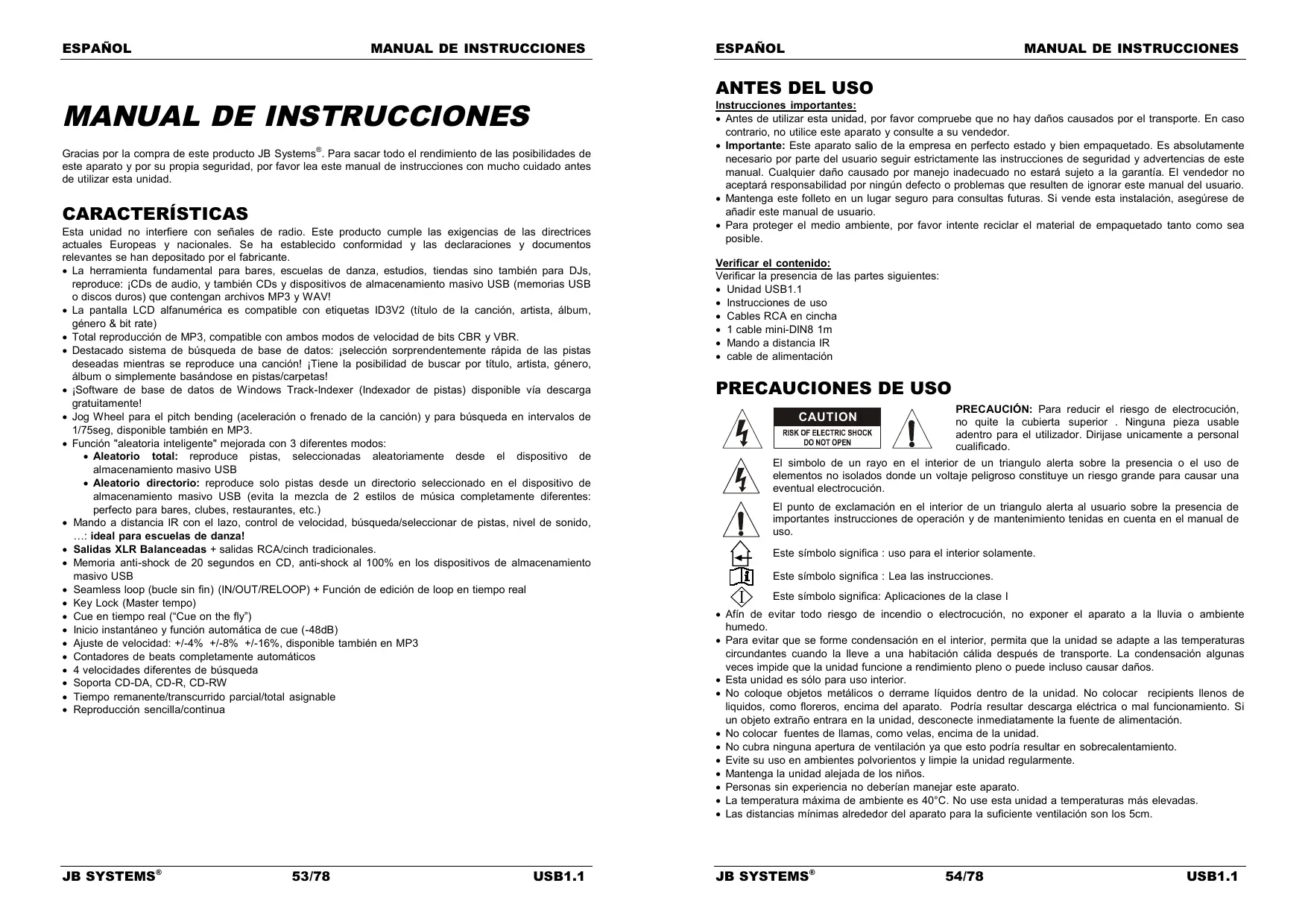 Gracias por la compra de este producto JB Systems . Para sacar todo el rendimiento de las posibilidades de este aparato y por su propia seguridad, por favor lea este manual de instrucciones con mucho cuidado antes de utilizar esta unidad. CARACTERÍSTICAS Esta unidad no interfiere con señales de radio. Este producto cumple las exigencias de las directrices actuales Europeas y nacionales. Se ha establecido conformidad y las declaraciones y documentos relevantes se han depositado por el fabricante. La herramienta fundamental para bares, escuelas de danza, estudios, tiendas sino también para DJs, reproduce: ¡CDs de audio, y también CDs y dispositivos de almacenamiento masivo USB (memorias USB o discos duros) que contengan archivos MP3 y WAV! La pantalla LCD alfanumérica es compatible con etiquetas ID3V2 (título de la canción, artista, álbum, género & bit rate) Total reproducción de MP3, compatible con ambos modos de velocidad de bits CBR y VBR. Destacado sistema de búsqueda de base de datos: ¡selección sorprendentemente rápida de las pistas deseadas mientras se reproduce una canción! ¡Tiene la posibilidad de buscar por título, artista, género, álbum o simplemente basándose en pistas/carpetas! ¡Software de base de datos de Windows Track-Indexer (Indexador de pistas) disponible vía descarga gratuitamente! Jog Wheel para el pitch bending (aceleración o frenado de la canción) y para búsqueda en intervalos de 1/75seg, disponible también en MP3. Función "aleatoria inteligente" mejorada con 3 diferentes modos: Aleatorio total: reproduce pistas, seleccionadas aleatoriamente desde el dispositivo de almacenamiento masivo USB Aleatorio directorio: reproduce solo pistas desde un directorio seleccionado en el dispositivo de almacenamiento masivo USB (evita la mezcla de 2 estilos de música completamente diferentes: perfecto para bares, clubes, restaurantes, etc.) Mando a distancia IR con el lazo, control de velocidad, búsqueda/seleccionar de pistas, nivel de sonido, …: ideal para escuelas de danza! Salidas XLR Balanceadas + salidas RCA/cinch tradicionales. Memoria anti-shock de 20 segundos en CD, anti-shock al 100% en los dispositivos de almacenamiento masivo USB Seamless loop (bucle sin fin) (IN/OUT/RELOOP) + Función de edición de loop en tiempo real Key Lock (Master tempo) Cue en tiempo real (“Cue on the fly”) Inicio instantáneo y función automática de cue (-48dB) Ajuste de velocidad: +/-4% +/-8% +/-16%, disponible también en MP3 Contadores de beats completamente automáticos 4 velocidades diferentes de búsqueda Soporta CD-DA, CD-R, CD-RW Tiempo remanente/transcurrido parcial/total asignable Reproducción sencilla/continua 53/78