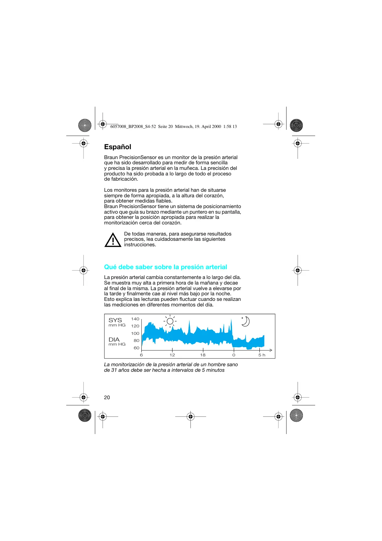 Español Braun PrecisionSensor es un monitor de la presión arterial que ha sido desarrollado para medir de forma sencilla y precisa la presión arterial en la muñeca. La precisión del producto ha sido probada a lo largo de todo el proceso de fabricación. Los monitores para la presión arterial han de situarse siempre de forma apropiada, a la altura del corazón, para obtener medidas fiables. Braun PrecisionSensor tiene un sistema de posicionamiento activo que guía su brazo mediante un puntero en su pantalla, para obtener la posición apropiada para realizar la monitorización cerca del corazón. De todas maneras, para asegurarse resultados precisos, lea cuidadosamente las siguientes instrucciones. Qué debe saber sobre la presión arterial La presión arterial cambia constantemente a lo largo del día. Se muestra muy alta a primera hora de la mañana y decae al final de la misma. La presión arterial vuelve a elevarse por la tarde y finalmente cae al nivel más bajo por la noche. Esto explica las lecturas pueden fluctuar cuando se realizan las mediciones en diferentes momentos del día. SYS