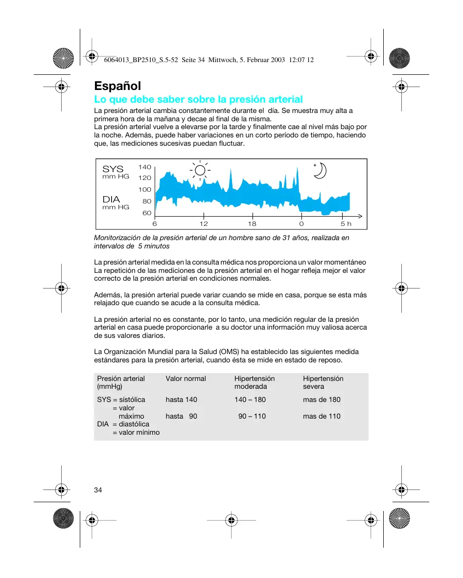 Español Lo que debe saber sobre la presión arterial La presión arterial cambia constantemente durante el día. Se muestra muy alta a primera hora de la mañana y decae al final de la misma. La presión arterial vuelve a elevarse por la tarde y finalmente cae al nivel más bajo por la noche. Además, puede haber variaciones en un corto período de tiempo, haciendo que, las mediciones sucesivas puedan fluctuar. SYS