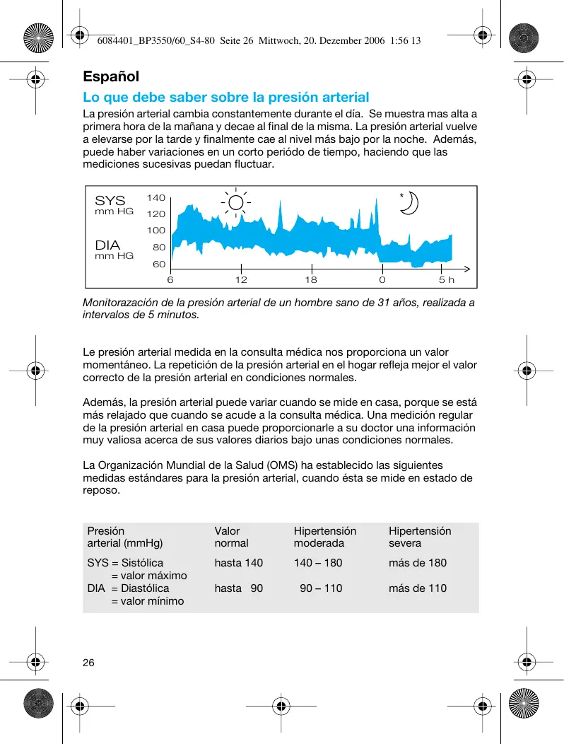 SensorControl Español Lo que debe saber sobre la presión arterial La presión arterial cambia constantemente durante el día. Se muestra mas alta a primera hora de la mañana y decae al final de la misma. La presión arterial vuelve a elevarse por la tarde y finalmente cae al nivel más bajo por la noche. Además, puede haber variaciones en un corto periódo de tiempo, haciendo que las mediciones sucesivas puedan fluctuar. SYS