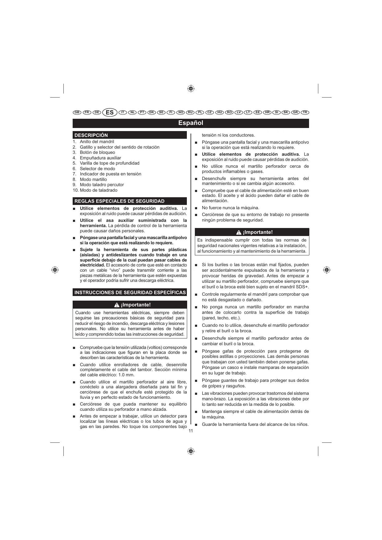 7. Indicador de puesta en tensión 8. Modo martillo 9. Modo taladro percutor 10. Modo de taladrado