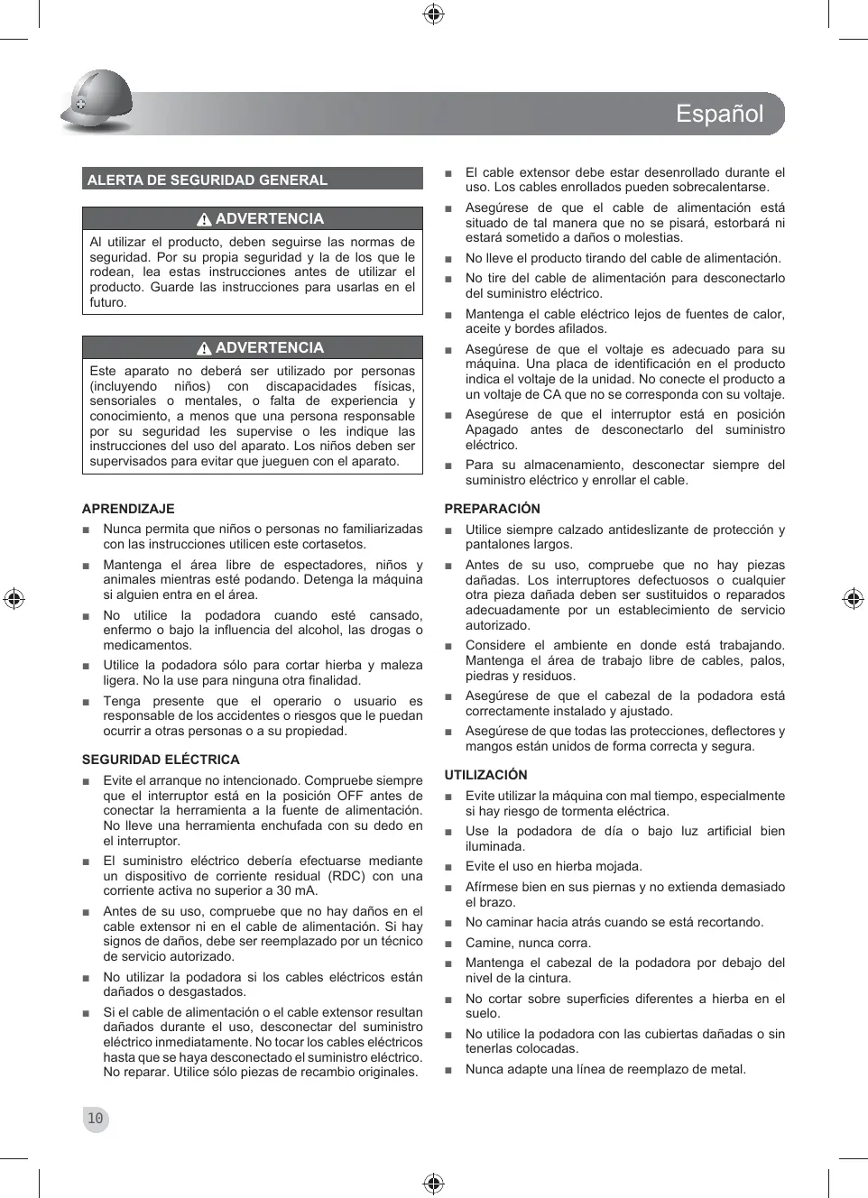 No utilice la podadora cuando esté cansado, enfermo o bajo la influencia del alcohol, las drogas o medicamentos. Antes de su uso, compruebe que no hay piezas dañadas. Los interruptores defectuosos o cualquier otra pieza dañada deben ser sustituidos o reparados adecuadamente por un establecimiento de servicio autorizado.