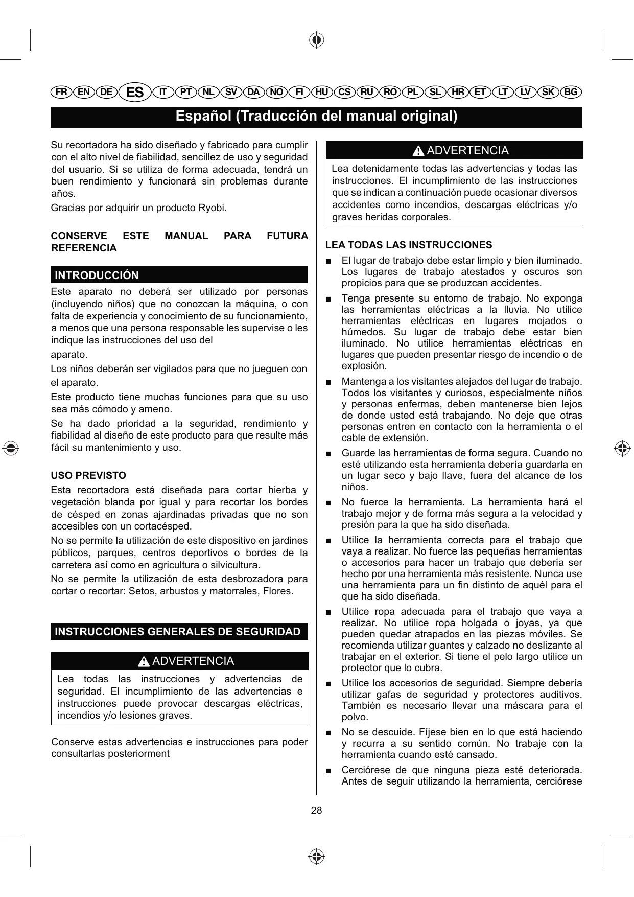 Español (Traducción del manual original) Su recortadora ha sido diseñado y fabricado para cumplir #%'"*)*$%'(4"*-"w)(*(-)-0"'#(**"<-"0%M0"82(-)- del usuario. Si se utiliza de forma adecuada, tendrá un buen rendimiento y funcionará sin problemas durante años. Gracias por adquirir un producto Ryobi. CONSERVE ESTE REFERENCIA MANUAL PARA ADVERTENCIA Lea detenidamente todas las advertencias y todas las instrucciones. El incumplimiento de las instrucciones que se indican a continuación puede ocasionar diversos accidentes como incendios, descargas eléctricas y/o graves heridas corporales. FUTURA