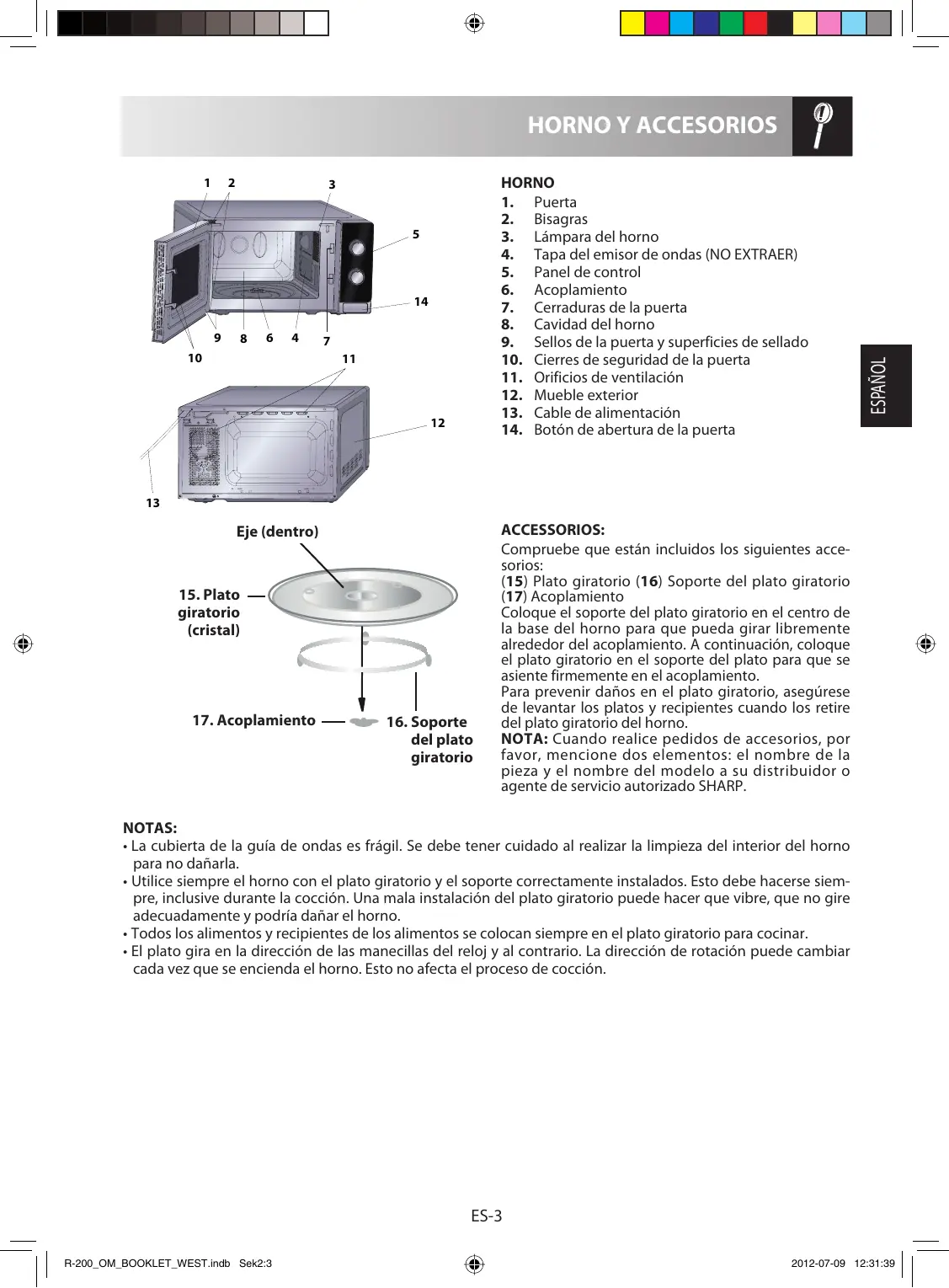 - El plato gira en la dirección de las manecillas del reloj y al contrario. La dirección de rotación puede cambiar cada vez que se encienda el horno. Esto no afecta el proceso de cocción. ES-3 R-200_OM_BOOKLET_WEST.indb Sek2:3 2012-07-09 12:31:39