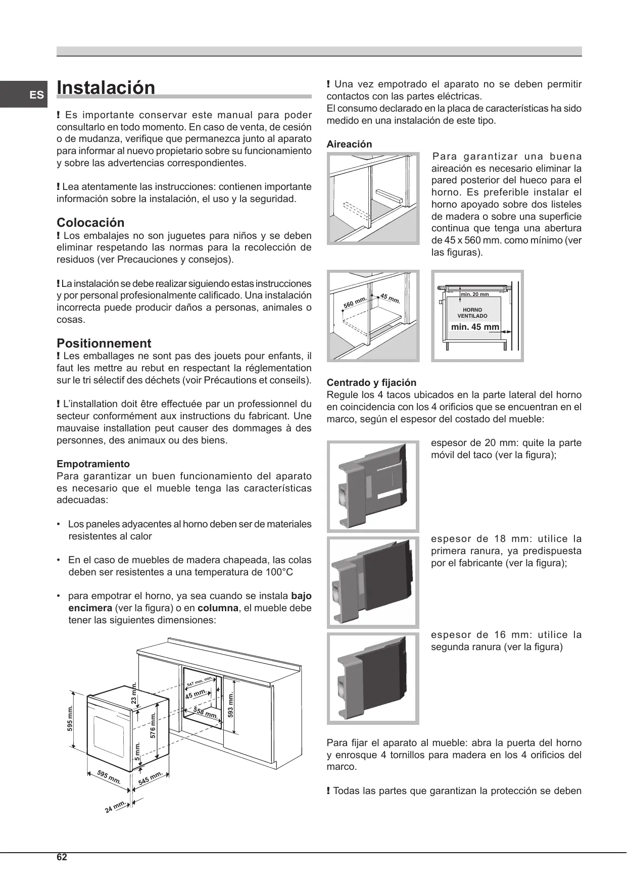 min. 20 mm HORNO VENTILADO min. 45 mm Positionnement ! Les emballages ne sont pas des jouets pour enfants, il faut les mettre au rebut en respectant la réglementation sur le tri sélectif des déchets (voir Précautions et conseils). ! L’installation doit être effectuée par un professionnel du secteur conformément aux instructions du fabricant. Une mauvaise installation peut causer des dommages à des personnes, des animaux ou des biens. Empotramiento Para garantizar un buen funcionamiento del aparato es necesario que el mueble tenga las características adecuadas: