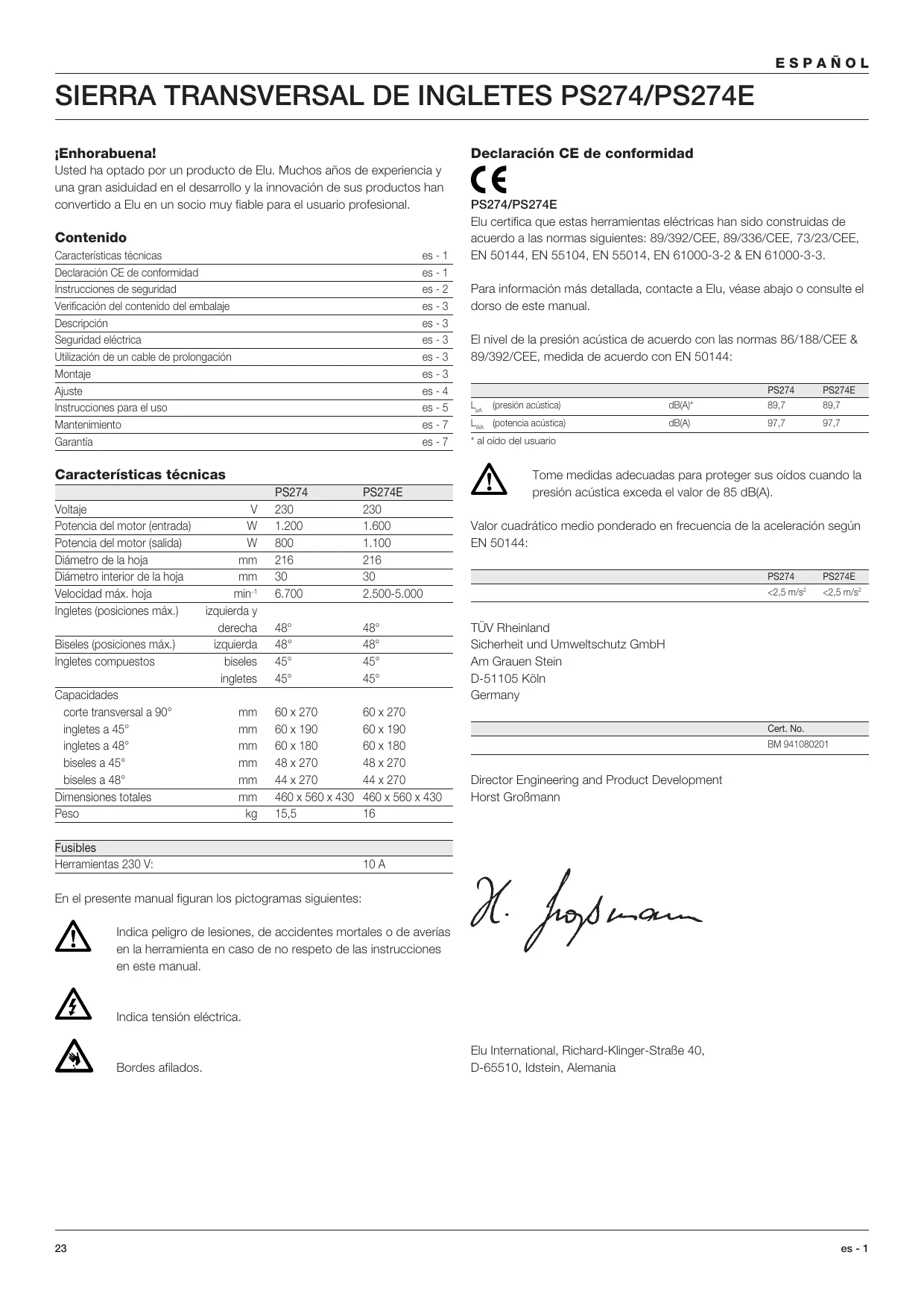 2.500-5.000 48° 48° 45° 45° 48° 48° 45° 45° Fusibles Herramientas 230 V: PS274/PS274E Elu certifica que estas herramientas eléctricas han sido construidas de acuerdo a las normas siguientes: 89/392/CEE, 89/336/CEE, 73/23/CEE, EN 50144, EN 55104, EN 55014, EN 61000-3-2 & EN 61000-3-3. Para información más detallada, contacte a Elu, véase abajo o consulte el dorso de este manual. El nivel de la presión acústica de acuerdo con las normas 86/188/CEE & 89/392/CEE, medida de acuerdo con EN 50144: PS274 LpA (presión acústica) LWA (potencia acústica) PS274E dB(A)* 89,7 89,7 dB(A) 97,7 97,7