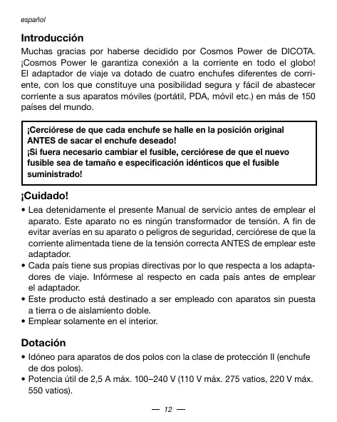 Muchas恭喜 por haberse decidebidir por Cosmos Power de DICOTA. Cosmos Power le garantiza conexion a la corrente en todo el globe! El adaptorado de viaje vaidotede quatre enchufes发展目标 de corrente, con los que constitueyuna posibidad segura y fácil de abastecer corrente a sus aparatos moviles (portatl, PDA, movil etc.) en mas de 150 paises del mundo.