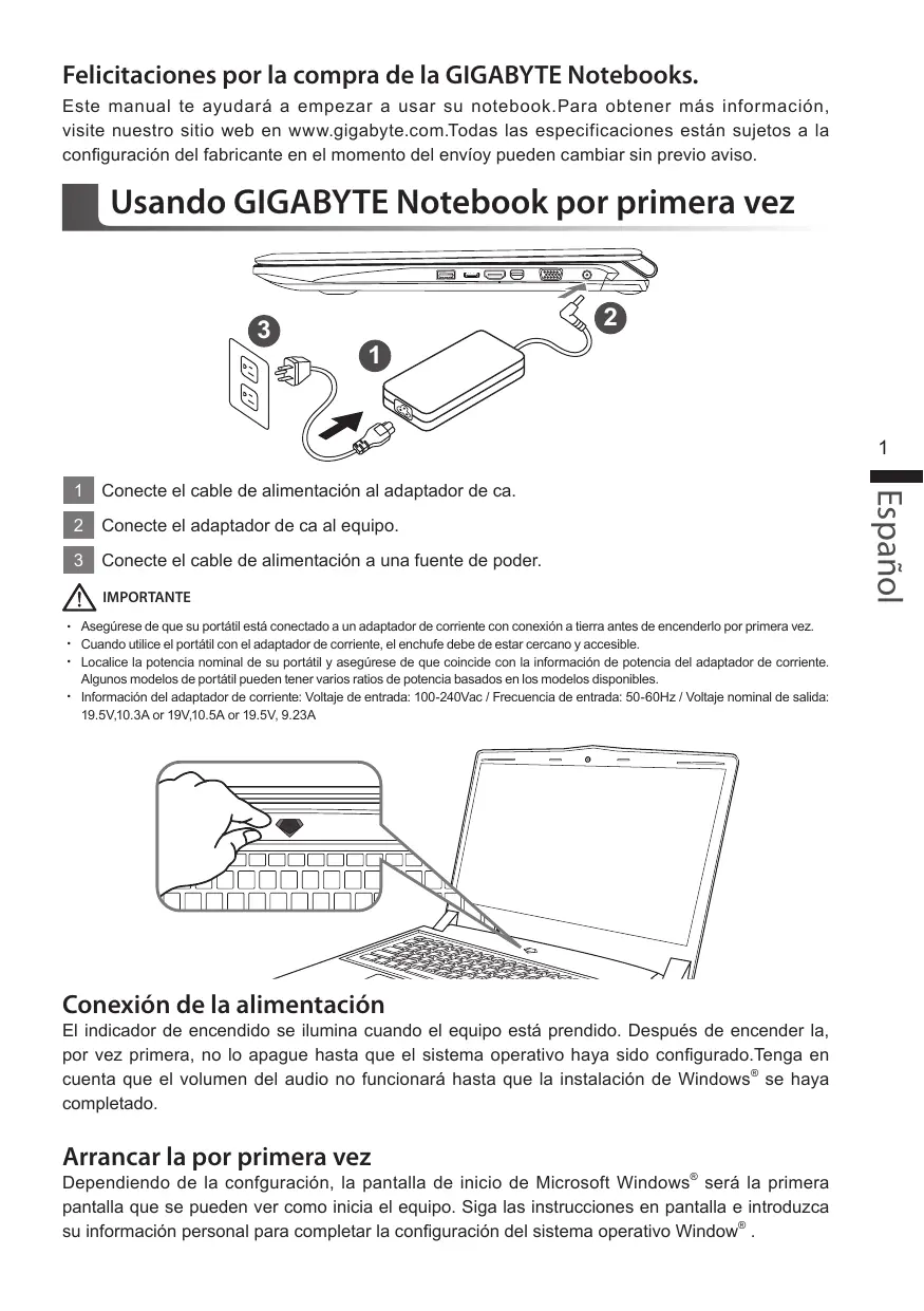 Felicitaciones por la compra de la GIGABYTE Notebooks. Este manual te ayudará a empezar a usar su notebook.Para obtener más información, visite nuestro sitio web en www.gigabyte.com.Todas las especificaciones están sujetos a la configuración del fabricante en el momento del envíoy pueden cambiar sin previo aviso.