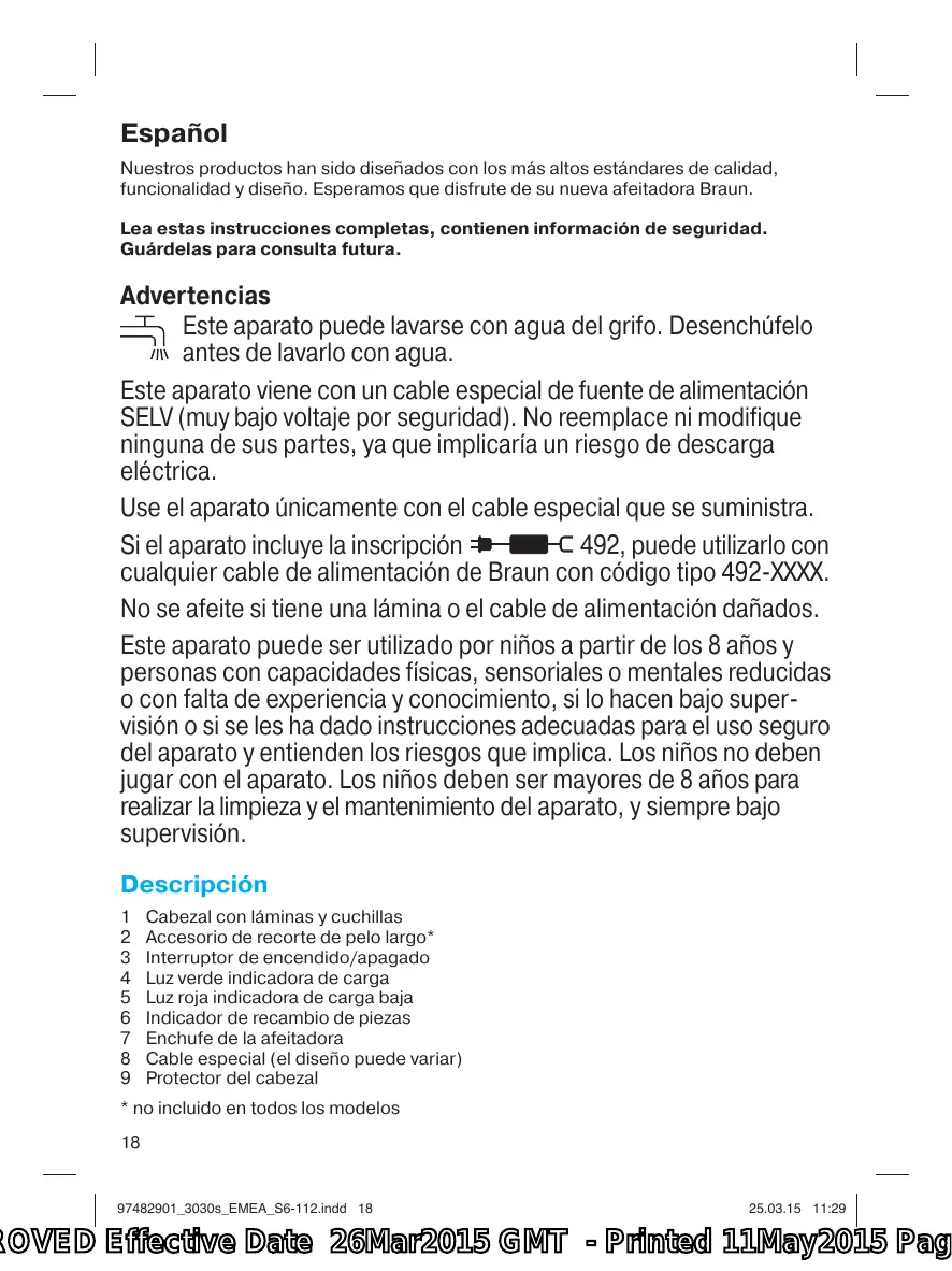 Este aparato puede lavarse con agua del grifo. Desenchúfelo antes de lavarlo con agua. Este aparato viene con un cable especial de fuente de alimentación SELV (muy bajo voltaje por seguridad). No reemplace ni modifique ninguna de sus partes, ya que implicaría un riesgo de descarga eléctrica. Use el aparato únicamente con el cable especial que se suministra. Si el aparato incluye la inscripción 492, puede utilizarlo con cualquier cable de alimentación de Braun con código tipo 492-XXXX. No se afeite si tiene una lámina o el cable de alimentación dañados. Este aparato puede ser utilizado por niños a partir de los 8 años y personas con capacidades físicas, sensoriales o mentales reducidas o con falta de experiencia y conocimiento, si lo hacen bajo supervisión o si se les ha dado instrucciones adecuadas para el uso seguro del aparato y entienden los riesgos que implica. Los niños no deben jugar con el aparato. Los niños deben ser mayores de 8 años para realizar la limpieza y el mantenimiento del aparato, y siempre bajo supervisión. Descripción 1 2 3 4 5 6 7 8 9