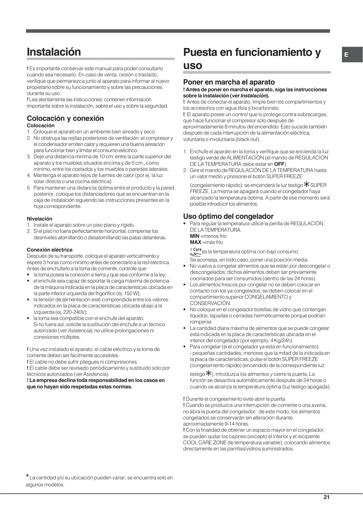 • la tensión de alimentación esté comprendida entre los valores indicados en la placa de características ubicada abajo a la izquierda (ej. 220-240V); • la toma sea compatible con el enchufe del aparato. Si no fuera así, solicite la sustitución del enchufe a un técnico autorizado (ver Asistencia); no utilice prolongaciones ni conexiones múltiples. ! Una vez instalado el aparato, el cable eléctrico y la toma de corriente deben ser fácilmente accesibles. ! El cable no debe sufrir pliegues ni compresiones. (congelamiento rápido) (encendido de la correspondiente luz testigo ), introduzca los alimentos y cierre la puerta. La función se desactiva automáticamente después de 24 horas o cuando se alcanza la temperatura óptima (luz testigo apagada);