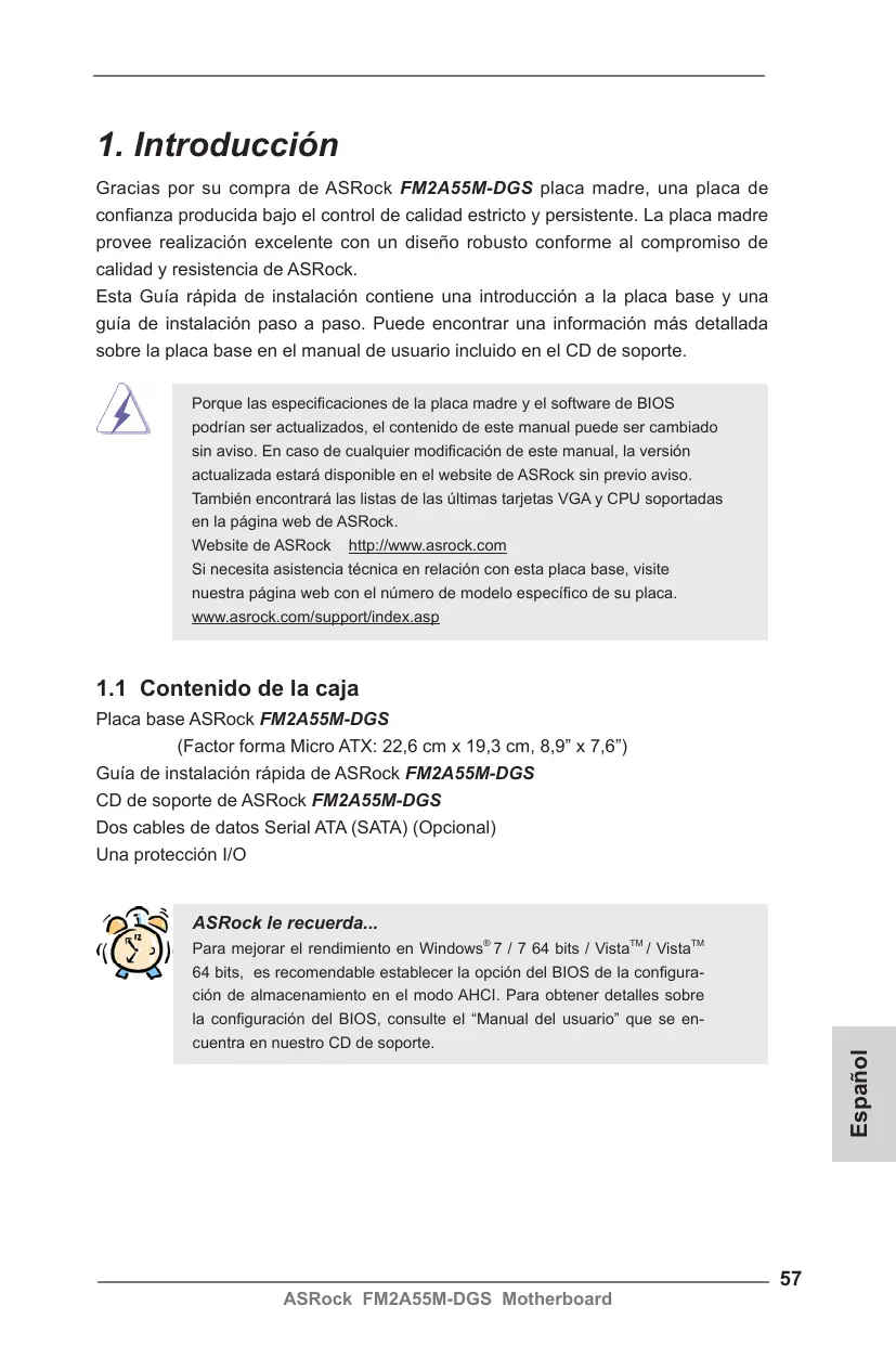 Placa base ASRock FM2A55M-DGS (Factor forma Micro ATX: 22,6 cm x 19,3 cm, 8,9” x 7,6”) Guía de instalación rápida de ASRock FM2A55M-DGS CD de soporte de ASRock FM2A55M-DGS Dos cables de datos Serial ATA (SATA) (Opcional) Una protección I/O ASRock le recuerda...