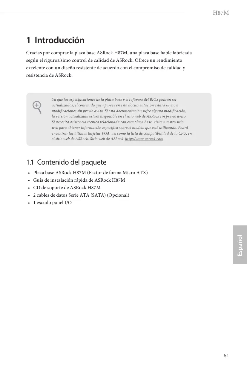 1 Introducción Gracias por comprar la placa base ASRock H87M, una placa base fiable fabricada según el rigurosísimo control de calidad de ASRock. Ofrece un rendimiento excelente con un diseño resistente de acuerdo con el compromiso de calidad y resistencia de ASRock.