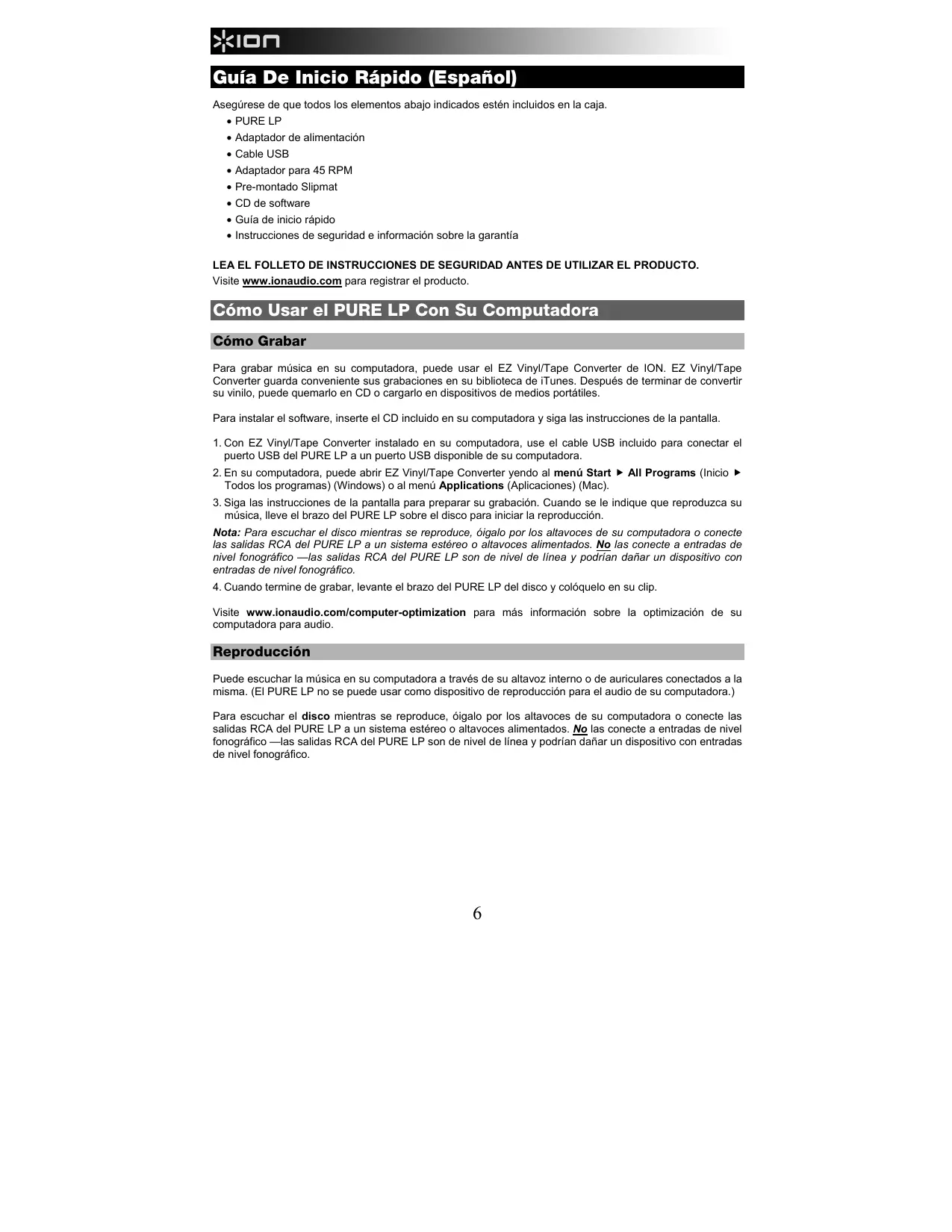 Pre-montado Slipmat CD de software Guía de inicio rápido Instrucciones de seguridad e información sobre la garantía LEA EL FOLLETO DE INSTRUCCIONES DE SEGURIDAD ANTES DE UTILIZAR EL PRODUCTO. Visite www.ionaudio.com para registrar el producto. Cómo Usar el PURE LP Con Su Computadora Cómo Grabar Para grabar música en su computadora, puede usar el EZ Vinyl/Tape Converter de ION. EZ Vinyl/Tape Converter guarda conveniente sus grabaciones en su biblioteca de iTunes. Después de terminar de convertir su vinilo, puede quemarlo en CD o cargarlo en dispositivos de medios portátiles. Para instalar el software, inserte el CD incluido en su computadora y siga las instrucciones de la pantalla.