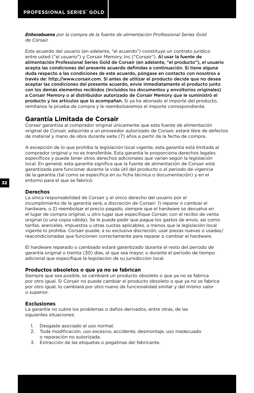 Enhorabuena por la compra de la fuente de alimentación Professional Series Gold de Corsair. Este acuerdo del usuario (en adelante, "el acuerdo") constituye un contrato jurídico entre usted ("el usuario") y Corsair Memory, Inc ("Corsair"). Al usar la fuente de alimentación Professional Series Gold de Corsair (en adelante, “el producto”), el usuario acepta las condiciones del presente acuerdo definidas a continuación. Si tiene alguna duda respecto a las condiciones de este acuerdo, póngase en contacto con nosotros a través de: http://www.corsair.com. Si antes de utilizar el producto decide que no desea aceptar las condiciones del presente acuerdo, envíe inmediatamente el producto junto con los demás elementos recibidos (incluidos los documentos y envoltorios originales) a Corsair Memory o al distribuidor autorizado de Corsair Memory que le suministró el producto y los artículos que lo acompañan. Si ya ha abonado el importe del producto, remítanos la prueba de compra y le reembolsaremos el importe correspondiente. Garantía Limitada de Corsair Corsair garantiza al comprador original únicamente que esta fuente de alimentación original de Corsair, adquirida a un proveedor autorizado de Corsair, estará libre de defectos de material y mano de obra durante siete (7) años a partir de la fecha de compra.