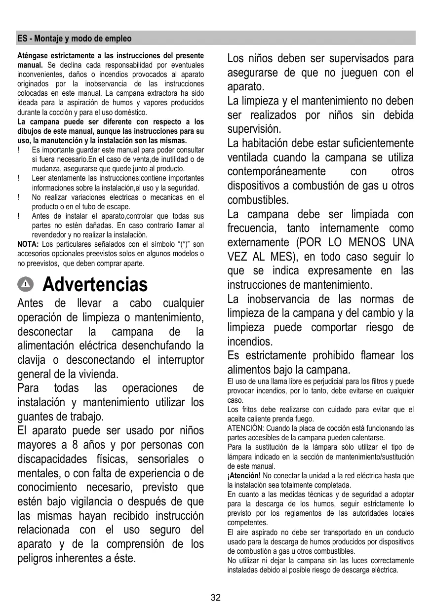 ES - Montaje y modo de empleo Aténgase estrictamente a las instrucciones del presente manual. Se declina cada responsabilidad por eventuales inconvenientes, daños o incendios provocados al aparato originados por la inobservancia de las instrucciones colocadas en este manual. La campana extractora ha sido ideada para la aspiración de humos y vapores producidos durante la cocción y para el uso doméstico. La campana puede ser diferente con respecto a los dibujos de este manual, aunque las instrucciones para su uso, la manutención y la instalación son las mismas. Es importante guardar este manual para poder consultar si fuera necesario.En el caso de venta,de inutilidad o de mudanza, asegurarse que quede junto al producto. Leer atentamente las instrucciones:contiene importantes informaciones sobre la instalación,el uso y la seguridad. No realizar variaciones electricas o mecanicas en el producto o en el tubo de escape. Antes de instalar el aparato,controlar que todas sus partes no estèn dañadas. En caso contrario llamar al revendedor y no realizar la instalaciòn. NOTA: Los particulares señalados con el símbolo “(*)” son accesorios opcionales preevistos solos en algunos modelos o no preevistos, que deben comprar aparte. Los niños deben ser supervisados para asegurarse de que no jueguen con el aparato. La limpieza y el mantenimiento no deben ser realizados por niños sin debida supervisión. La habitación debe estar suficientemente ventilada cuando la campana se utiliza contemporáneamente con otros dispositivos a combustión de gas u otros combustibles. La campana debe ser limpiada con frecuencia, tanto internamente como externamente (POR LO MENOS UNA VEZ AL MES), en todo caso seguir lo que se indica expresamente en las instrucciones de mantenimiento. La inobservancia de las normas de limpieza de la campana y del cambio y la limpieza puede comportar riesgo de incendios. Es estrictamente prohibido flamear los alimentos bajo la campana. Advertencias Antes de llevar a cabo cualquier operación de limpieza o mantenimiento, desconectar la campana de la alimentación eléctrica desenchufando la clavija o desconectando el interruptor general de la vivienda. Para todas las operaciones de instalación y mantenimiento utilizar los guantes de trabajo. El aparato puede ser usado por niños mayores a 8 años y por personas con discapacidades físicas, sensoriales o mentales, o con falta de experiencia o de conocimiento necesario, previsto que estén bajo vigilancia o después de que las mismas hayan recibido instrucción relacionada con el uso seguro del aparato y de la comprensión de los peligros inherentes a éste. El uso de una llama libre es perjudicial para los filtros y puede provocar incendios, por lo tanto, debe evitarse en cualquier caso. Los fritos debe realizarse con cuidado para evitar que el aceite caliente prenda fuego. ATENCIÓN: Cuando la placa de cocción está funcionando las partes accesibles de la campana pueden calentarse. Para la sustitución de la lámpara sólo utilizar el tipo de lámpara indicado en la sección de mantenimiento/sustitución de este manual. ¡Atención! No conectar la unidad a la red eléctrica hasta que la instalación sea totalmente completada. En cuanto a las medidas técnicas y de seguridad a adoptar para la descarga de los humos, seguir estrictamente lo previsto por los reglamentos de las autoridades locales competentes. El aire aspirado no debe ser transportado en un conducto usado para la descarga de humos producidos por dispositivos de combustión a gas u otros combustibles. No utilizar ni dejar la campana sin las luces correctamente instaladas debido al posible riesgo de descarga eléctrica.