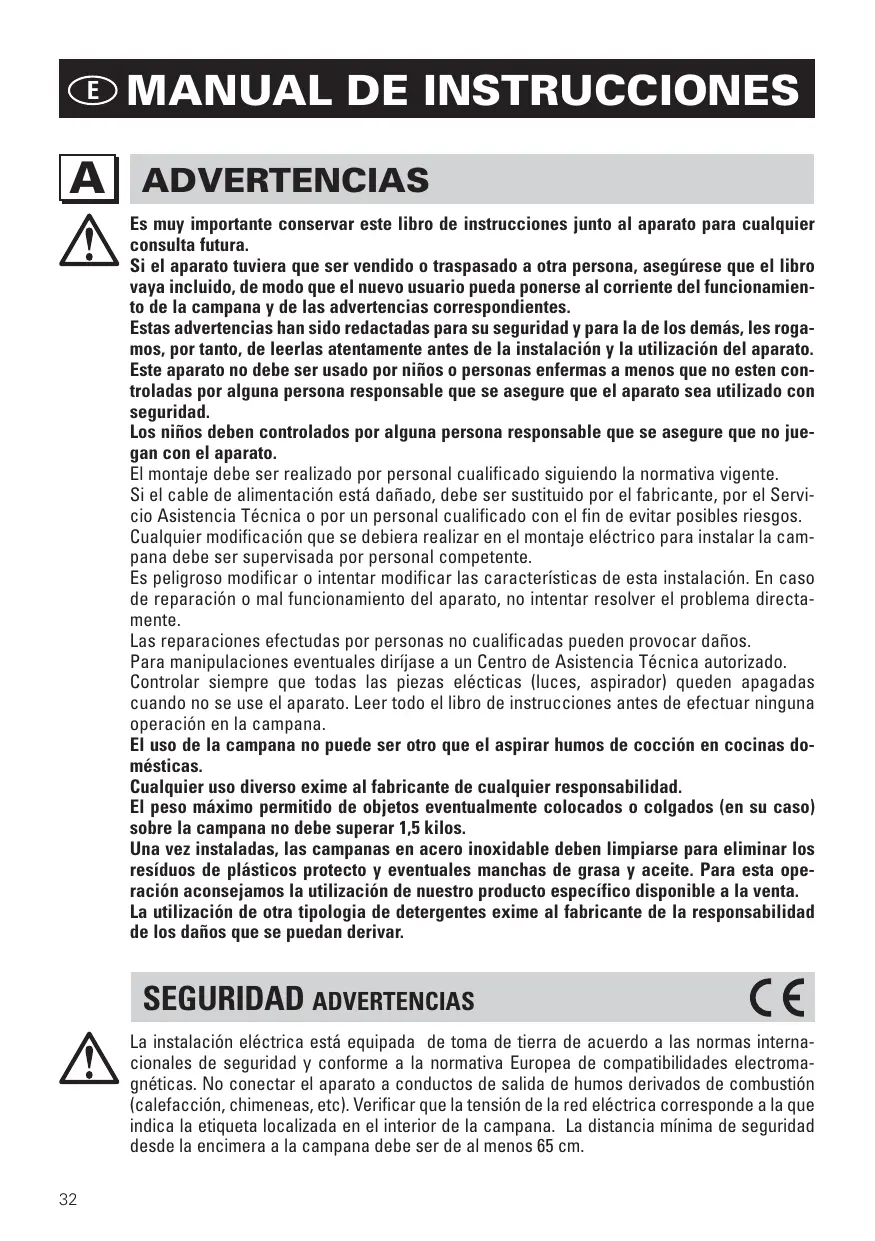 ADVERTENCIAS Es muy importante conservar este libro de instrucciones junto al aparato para cualquier consulta futura. Si el aparato tuviera que ser vendido o traspasado a otra persona, asegúrese que el libro vaya incluido, de modo que el nuevo usuario pueda ponerse al corriente del funcionamiento de la campana y de las advertencias correspondientes. Estas advertencias han sido redactadas para su seguridad y para la de los demás, les rogamos, por tanto, de leerlas atentamente antes de la instalación y la utilización del aparato. Este aparato no debe ser usado por niños o personas enfermas a menos que no esten controladas por alguna persona responsable que se asegure que el aparato sea utilizado con seguridad. Los niños deben controlados por alguna persona responsable que se asegure que no juegan con el aparato. El montaje debe ser realizado por personal cualificado siguiendo la normativa vigente. Si el cable de alimentación está dañado, debe ser sustituido por el fabricante, por el Servicio Asistencia Técnica o por un personal cualificado con el fin de evitar posibles riesgos. Cualquier modificación que se debiera realizar en el montaje eléctrico para instalar la campana debe ser supervisada por personal competente. Es peligroso modificar o intentar modificar las características de esta instalación. En caso de reparación o mal funcionamiento del aparato, no intentar resolver el problema directamente. Las reparaciones efectudas por personas no cualificadas pueden provocar daños. Para manipulaciones eventuales diríjase a un Centro de Asistencia Técnica autorizado. Controlar siempre que todas las piezas elécticas (luces, aspirador) queden apagadas cuando no se use el aparato. Leer todo el libro de instrucciones antes de efectuar ninguna operación en la campana. El uso de la campana no puede ser otro que el aspirar humos de cocción en cocinas domésticas. Cualquier uso diverso exime al fabricante de cualquier responsabilidad. El peso máximo permitido de objetos eventualmente colocados o colgados (en su caso) sobre la campana no debe superar 1,5 kilos. Una vez instaladas, las campanas en acero inoxidable deben limpiarse para eliminar los resíduos de plásticos protecto y eventuales manchas de grasa y aceite. Para esta operación aconsejamos la utilización de nuestro producto específico disponible a la venta. La utilización de otra tipologia de detergentes exime al fabricante de la responsabilidad de los daños que se puedan derivar. SEGURIDAD ADVERTENCIAS La instalación eléctrica está equipada de toma de tierra de acuerdo a las normas internacionales de seguridad y conforme a la normativa Europea de compatibilidades electromagnéticas. No conectar el aparato a conductos de salida de humos derivados de combustión (calefacción, chimeneas, etc). Verificar que la tensión de la red eléctrica corresponde a la que indica la etiqueta localizada en el interior de la campana. La distancia mínima de seguridad desde la encimera a la campana debe ser de al menos 65 cm.