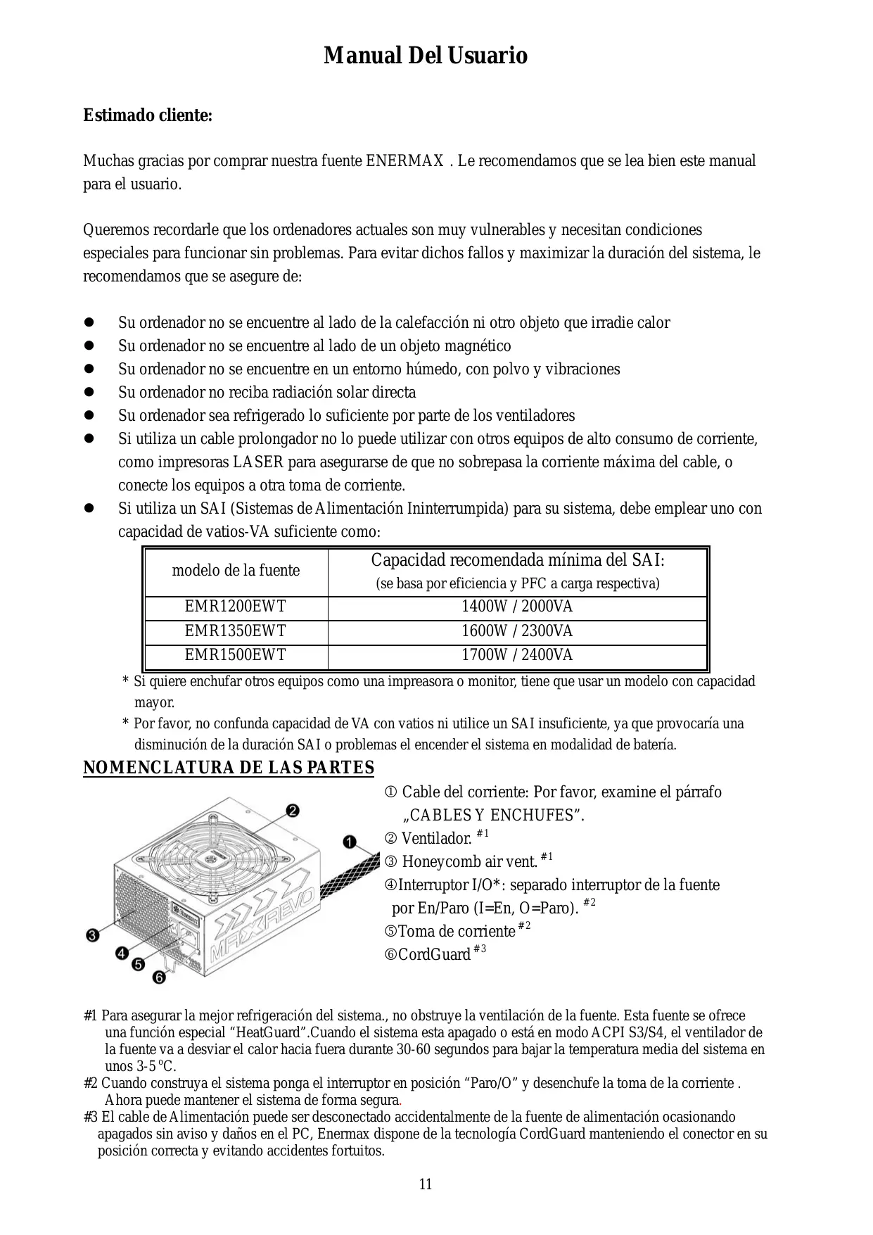 #1 Para asegurar la mejor refrigeración del sistema., no obstruye la ventilación de la fuente. Esta fuente se ofrece una función especial “HeatGuard”.Cuando el sistema esta apagado o está en modo ACPI S3/S4, el ventilador de la fuente va a desviar el calor hacia fuera durante 30-60 segundos para bajar la temperatura media del sistema en unos 3-5 oC. #2 Cuando construya el sistema ponga el interruptor en posición “Paro/O” y desenchufe la toma de la corriente . Ahora puede mantener el sistema de forma segura. #3 El cable de Alimentación puede ser desconectado accidentalmente de la fuente de alimentación ocasionando apagados sin aviso y daños en el PC, Enermax dispone de la tecnología CordGuard manteniendo el conector en su posición correcta y evitando accidentes fortuitos. 11