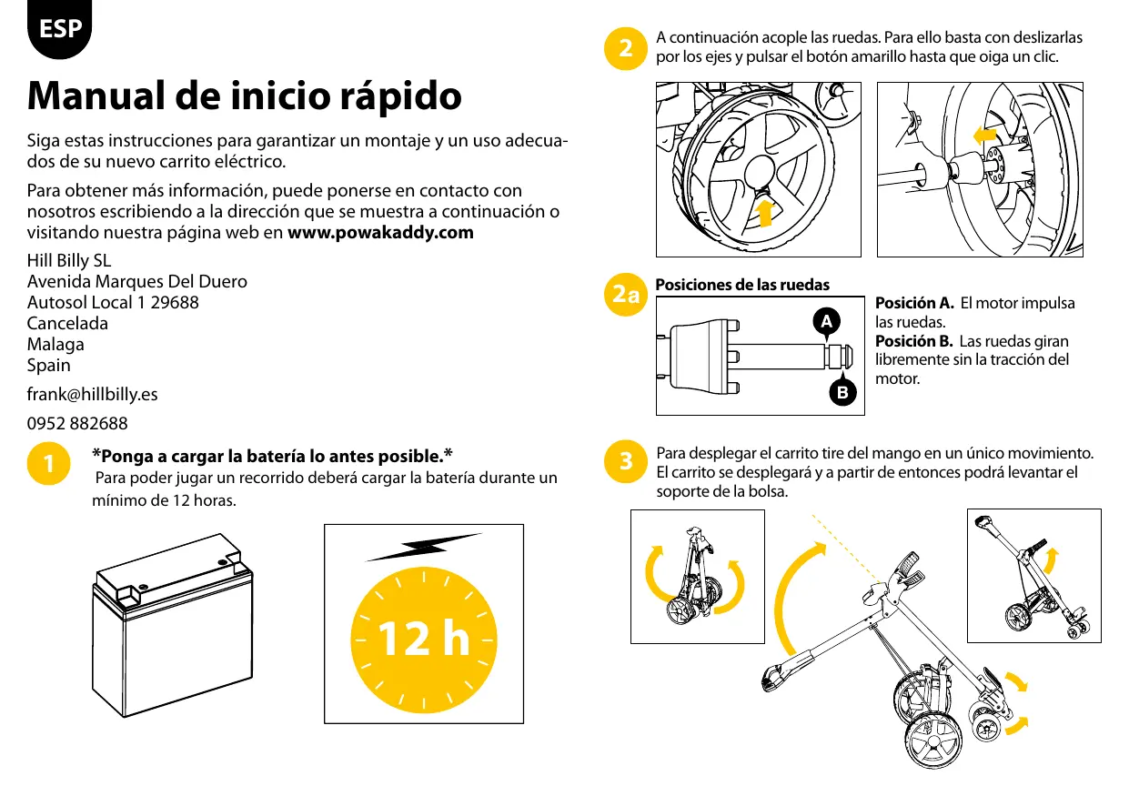 A continuación acople las ruedas. Para ello basta con deslizarlas por los ejes y pulsar el botón amarillo hasta que oiga un clic. Manual de inicio rápido Siga estas instrucciones para garantizar un montaje y un uso adecuados de su nuevo carrito eléctrico. Para obtener más información, puede ponerse en contacto con nosotros escribiendo a la dirección que se muestra a continuación o visitando nuestra página web en www.powakaddy.com Hill Billy SL Avenida Marques Del Duero Autosol Local 1 29688 Cancelada Malaga Spain