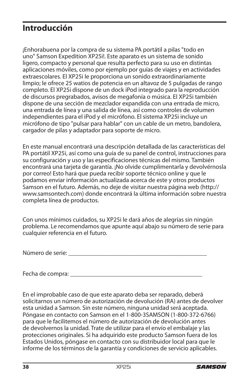 iEnhorabuena por la compra de su sistemas PA portátil a pilas "todeno en uno" Samson Expedition XP25i!. Este aparato es un sistemas de sonido ligero, compacto y personal que resulta perfecto para su uso en-distinas aplicaciones moviles, como por exemple por guias de viajes y enactividades extraescolares. El XP25i le proporciona un sonidoextraordinariamente limpio; le ofrece 25 watos de potencia en un altavoz de 5 pulgadas de rango completo. El XP25i dispone de un dock iPod integrado para la reproduccion de discuros pregrabados, avisos de megafonia o música. El XP25i también dispone de una seccion de mezclador expandida con una entrada de micro, una entrada de linea y una calidad de linea, asi como controles de volumen independentes para el iPod y el micrófono. El sistemas XP25i incluye un micrófono de tipo "pulsar para haber" con un cable de un metro, bandolera, cargador de pilas y adaptador para soporte de micro.