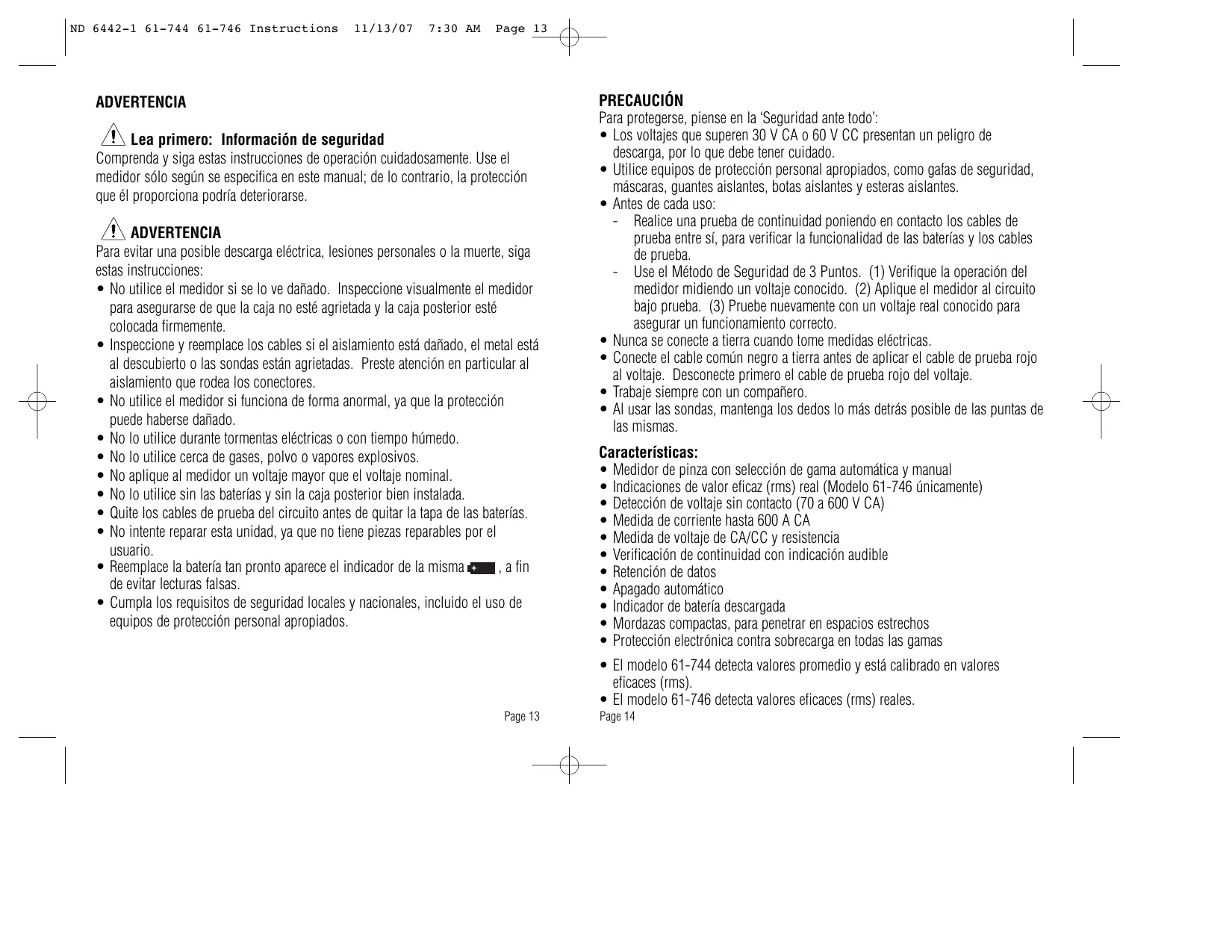 - El modelo 61-746 detecta valores eficaces (rms) reales. Page 13 Page 14 ND 6442-1 61-744 61-746 Instructions Características