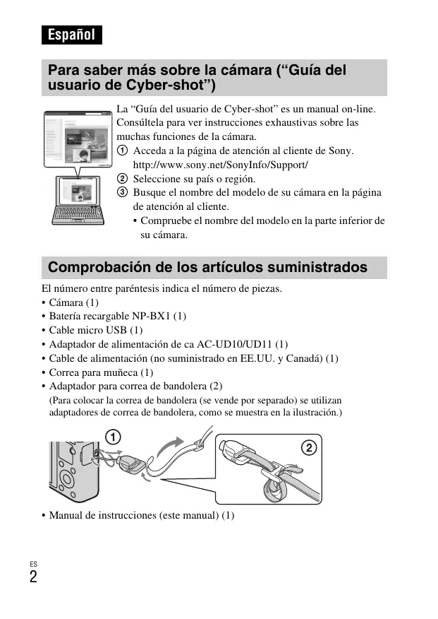 Español Para saber más sobre la cámara (“Guía del usuario de Cyber-shot”) La “Guía del usuario de Cyber-shot” es un manual on-line. Consúltela para ver instrucciones exhaustivas sobre las muchas funciones de la cámara. 1 Acceda a la página de atención al cliente de Sony. http://www.sony.net/SonyInfo/Support/ 2 Seleccione su país o región. 3 Busque el nombre del modelo de su cámara en la página de atención al cliente.