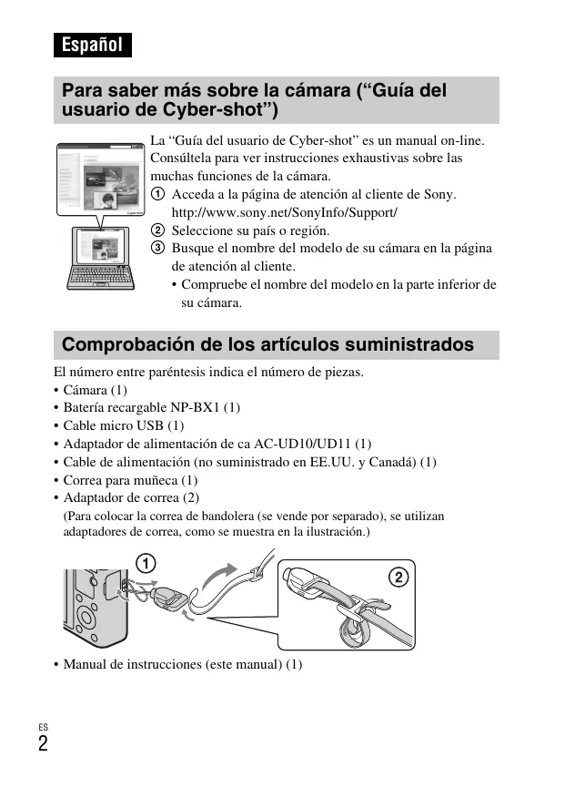 Español Para saber más sobre la cámara (“Guía del usuario de Cyber-shot”) La “Guía del usuario de Cyber-shot” es un manual on-line. Consúltela para ver instrucciones exhaustivas sobre las muchas funciones de la cámara. 1 Acceda a la página de atención al cliente de Sony. http://www.sony.net/SonyInfo/Support/ 2 Seleccione su país o región. 3 Busque el nombre del modelo de su cámara en la página de atención al cliente.