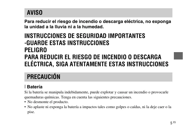 - No aplaste ni exponga la batería a impactos tales como golpes o caídas, ni la deje caer o la pise. 5 ES