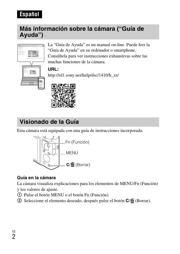 Manopola del modo Tempo ingr. mes. fu. Funz. Zoom su anello Menu a riquadri Español Más información sobre la cámara (“Guía de Ayuda”) La “Guía de Ayuda” es un manual on-line. Puede leer la “Guía de Ayuda” en su ordenador o smartphone. Consúltela para ver instrucciones exhaustivas sobre las muchas funciones de la cámara. URL: http://rd1.sony.net/help/dsc/1410/h_zz/ Visionado de la Guía Esta cámara está equipada con una guía de instrucciones incorporada. Fn (Función) MENU