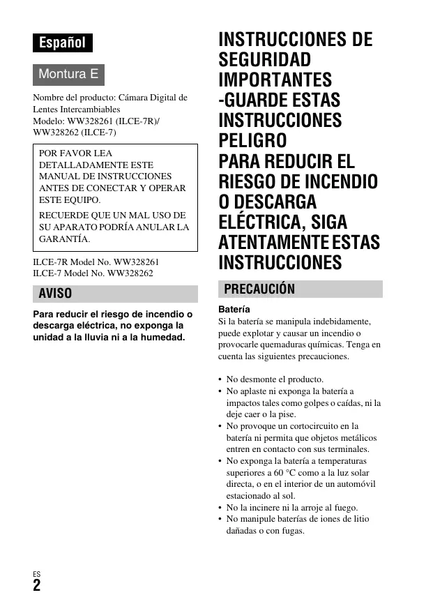 Montura E Nombre del producto: Cámara Digital de Lentes Intercambiables Modelo: WW328261 (ILCE-7R)/ WW328262 (ILCE-7) POR FAVOR LEA DETALLADAMENTE ESTE MANUAL DE INSTRUCCIONES ANTES DE CONECTAR Y OPERAR ESTE EQUIPO. RECUERDE QUE UN MAL USO DE SU APARATO PODRÍA ANULAR LA GARANTÍA. ILCE-7R Model No. WW328261 ILCE-7 Model No. WW328262