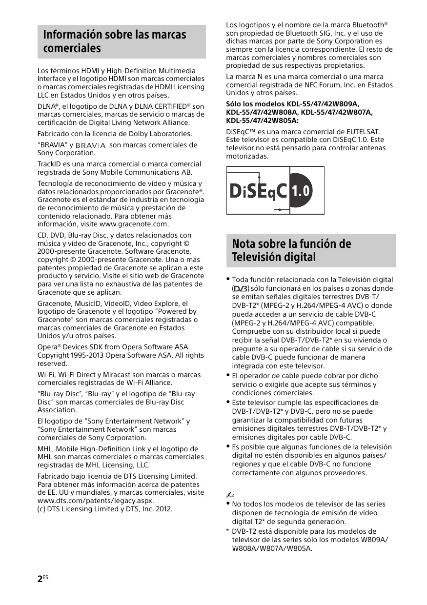 Información sobre las marcas comerciales Los términos HDMI y High-Definition Multimedia Interface y el logotipo HDMI son marcas comerciales o marcas comerciales registradas de HDMI Licensing LLC en Estados Unidos y en otros países. Los logotipos y el nombre de la marca Bluetooth® son propiedad de Bluetooth SIG, Inc. y el uso de dichas marcas por parte de Sony Corporation es siempre con la licencia correspondiente. El resto de marcas comerciales y nombres comerciales son propiedad de sus respectivos propietarios. La marca N es una marca comercial o una marca comercial registrada de NFC Forum, Inc. en Estados Unidos y otros países. DLNA®, el logotipo de DLNA y DLNA CERTIFIED® son marcas comerciales, marcas de servicio o marcas de certificación de Digital Living Network Alliance. Fabricado con la licencia de Dolby Laboratories. DiSEqC™ es una marca comercial de EUTELSAT. Este televisor es compatible con DiSEqC 1.0. Este televisor no está pensado para controlar antenas motorizadas. son marcas comerciales de TrackID es una marca comercial o marca comercial registrada de Sony Mobile Communications AB. Tecnología de reconocimiento de vídeo y música y datos relacionados proporcionados por Gracenote®. Gracenote es el estándar de industria en tecnología de reconocimiento de música y prestación de contenido relacionado. Para obtener más información, visite www.gracenote.com. CD, DVD, Blu-ray Disc, y datos relacionados con música y vídeo de Gracenote, Inc., copyright © 2000-presente Gracenote. Software Gracenote, copyright © 2000-presente Gracenote. Una o más patentes propiedad de Gracenote se aplican a este producto y servicio. Visite el sitio web de Gracenote para ver una lista no exhaustiva de las patentes de Gracenote que se aplican. Gracenote, MusicID, VideoID, Video Explore, el logotipo de Gracenote y el logotipo “Powered by Gracenote” son marcas comerciales registradas o marcas comerciales de Gracenote en Estados Unidos y/u otros países. Opera® Devices SDK from Opera Software ASA. Copyright 1995-2013 Opera Software ASA. All rights reserved. Wi-Fi, Wi-Fi Direct y Miracast son marcas o marcas comerciales registradas de Wi-Fi Alliance. “Blu-ray Disc”, “Blu-ray” y el logotipo de “Blu-ray Disc” son marcas comerciales de Blu-ray Disc Association. El logotipo de “Sony Entertainment Network” y “Sony Entertainment Network” son marcas comerciales de Sony Corporation. MHL, Mobile High-Definition Link y el logotipo de MHL son marcas comerciales o marcas comerciales registradas de MHL Licensing, LLC. Fabricado bajo licencia de DTS Licensing Limited. Para obtener más información acerca de patentes de EE. UU y mundiales, y marcas comerciales, visite www.dts.com/patents/legacy.aspx. (c) DTS Licensing Limited y DTS, Inc. 2012. 2ES Nota sobre la función de Televisión digital Toda función relacionada con la Televisión digital ) sólo funcionará en los países o zonas donde se emitan señales digitales terrestres DVB-T/ DVB-T2* (MPEG-2 y H.264/MPEG-4 AVC) o donde pueda acceder a un servicio de cable DVB-C (MPEG-2 y H.264/MPEG-4 AVC) compatible. Compruebe con su distribuidor local si puede recibir la señal DVB-T/DVB-T2* en su vivienda o pregunte a su operador de cable si su servicio de cable DVB-C puede funcionar de manera integrada con este televisor. El operador de cable puede cobrar por dicho servicio o exigirle que acepte sus términos y condiciones comerciales. Este televisor cumple las especificaciones de DVB-T/DVB-T2* y DVB-C, pero no se puede garantizar la compatibilidad con futuras emisiones digitales terrestres DVB-T/DVB-T2* y emisiones digitales por cable DVB-C. Es posible que algunas funciones de la televisión digital no estén disponibles en algunos países/ regiones y que el cable DVB-C no funcione correctamente con algunos proveedores. No todos los modelos de televisor de las series disponen de tecnología de emisión de vídeo digital T2* de segunda generación.
