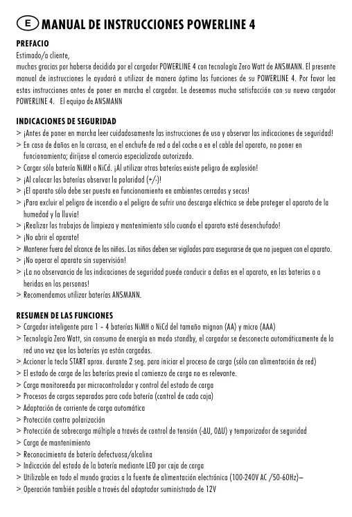 E Manual de instrucciones POWERLINE 4 PREFACIO Estimado/a cliente, muchas gracias por haberse decidido por el cargador POWERLINE 4 con tecnología Zero Watt de ANSMANN. El presente manual de instrucciones le ayudará a utilizar de manera óptima las funciones de su POWERLINE 4. Por favor lea estas instrucciones antes de poner en marcha el cargador. Le deseamos mucha satisfacción con su nuevo cargador POWERLINE 4. El equipo de ANSMANN INDICACIONES DE SEGURIDAD > ¡Antes de poner en marcha leer cuidadosamente las instrucciones de uso y observar las indicaciones de seguridad! > En caso de daños en la carcasa, en el enchufe de red o del coche o en el cable del aparato, no poner en funcionamiento; diríjase al comercio especializado autorizado. > Cargar sólo batería NiMH o NiCd. ¡Al utilizar otras baterías existe peligro de explosión! > ¡Al colocar las baterías observar la polaridad (+/-)! > ¡El aparato sólo debe ser puesto en funcionamiento en ambientes cerrados y secos! > ¡Para excluir el peligro de incendio o el peligro de sufrir una descarga eléctrica se debe proteger al aparato de la humedad y la lluvia! > ¡Realizar los trabajos de limpieza y mantenimiento sólo cuando el aparato esté desenchufado! > ¡No abrir el aparato! > Mantener fuera del alcance de los niños. Los niños deben ser vigilados para asegurarse de que no jueguen con el aparato. > ¡No operar el aparato sin supervisión! > ¡La no observancia de las indicaciones de seguridad puede conducir a daños en el aparato, en las baterías o a heridas en las personas! > Recomendamos utilizar baterías ANSMANN. RESUMEN DE LAS FUNCIONES > Cargador inteligente para 1 – 4 baterías NiMH o NiCd del tamaño mignon (AA) y micro (AAA) > Tecnología Zero Watt, sin consumo de energía en modo standby, el cargador se desconecta automáticamente de la red una vez que las baterías ya están cargadas. > Accionar la tecla START aprox. durante 2 seg. para iniciar el proceso de carga (sólo con alimentación de red) > El estado de carga de las baterías previo al comienzo de carga no es relevante. > Carga monitoreada por microcontrolador y control del estado de carga > Procesos de cargas separados para cada batería (control de cada caja) > Adaptación de corriente de carga automática > Protección contra polarización > Protección de sobrecarga múltiple a través de control de tensión (-ΔU, 0ΔU) y temporizador de seguridad > Carga de mantenimiento > Reconocimiento de batería defectuosa/alcalina > Indicación del estado de la batería mediante LED por caja de carga > Utilizable en todo el mundo gracias a la fuente de alimentación electrónica (100-240V AC /50-60Hz)—