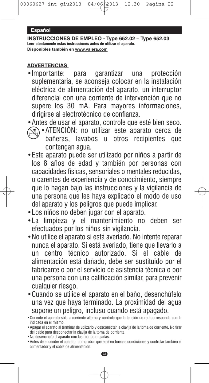 INSTRUCCIONES DE EMPLEO - Type 652.02 – Type 652.03 Leer atentamente estas instrucciones antes de utilizar el aparato. Disponibles también en www.valera.com