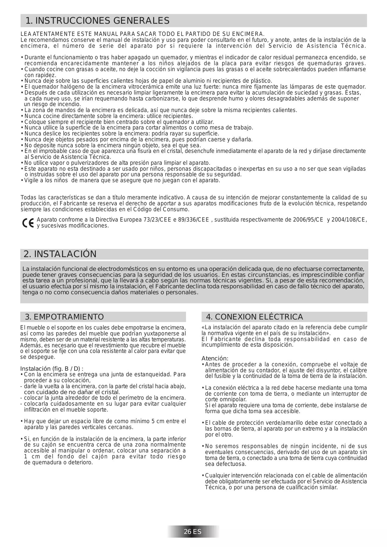 LEA ATENTAMENTE ESTE MANUAL PARA SACAR TODO EL PARTIDO DE SU ENCIMERA. Le recomendamos conserve el manual de instalación y uso para poder consultarlo en el futuro, y anote, antes de la instalación de la encimera, el número de serie del aparato por si requiere la intervención del Servicio de Asistencia Técnica.