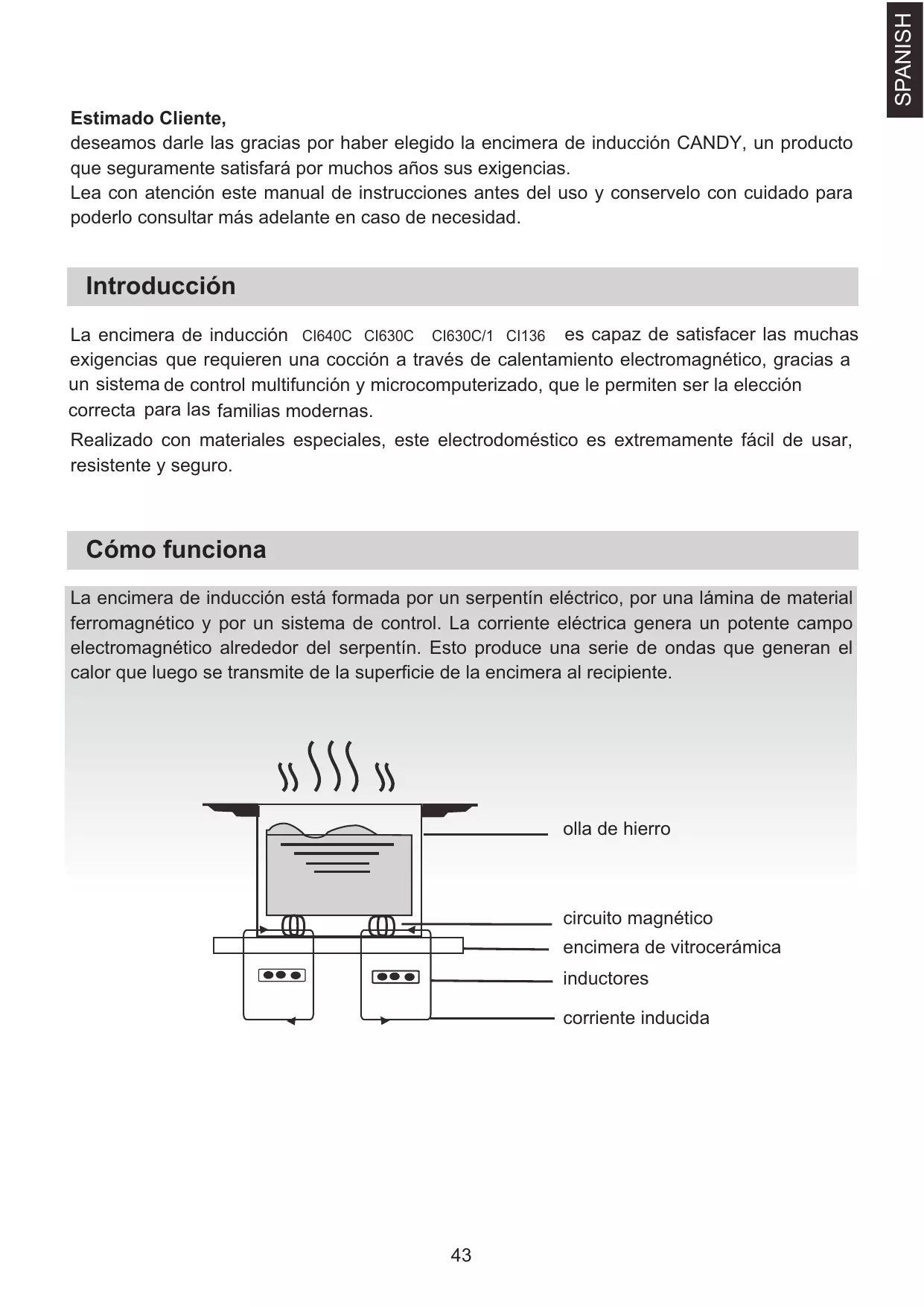 Manual de instrucciones para encimera de inducción SPANISH FINN SPANISH Estimado Cliente, deseamos darle las gracias por haber elegido la encimera de inducción CANDY, un producto que seguramente satisfará por muchos años sus exigencias. Lea con atención este manual de instrucciones antes del uso y conservelo con cuidado para poderlo consultar más adelante en caso de necesidad. Introducción La encimera de inducción CI640C CI630C CI630C/1 CI136 es capaz de satisfacer las muchas exigencias que requieren una cocción a través de calentamiento electromagnético, gracias a un sistema de control multifunción y microcomputerizado, que le permiten ser la elección correcta para las familias modernas. Realizado con materiales especiales, este electrodoméstico es extremamente fácil de usar, resistente y seguro. Cómo funciona La encimera de inducción está formada por un serpentín eléctrico, por una lámina de material ferromagnético y por un sistema de control. La corriente eléctrica genera un potente campo electromagnético alrededor del serpentín. Esto produce una serie de ondas que generan el calor que luego se transmite de la superficie de la encimera al recipiente. olla de hierro circuito magnético encimera de vitrocerámica inductores corriente inducida