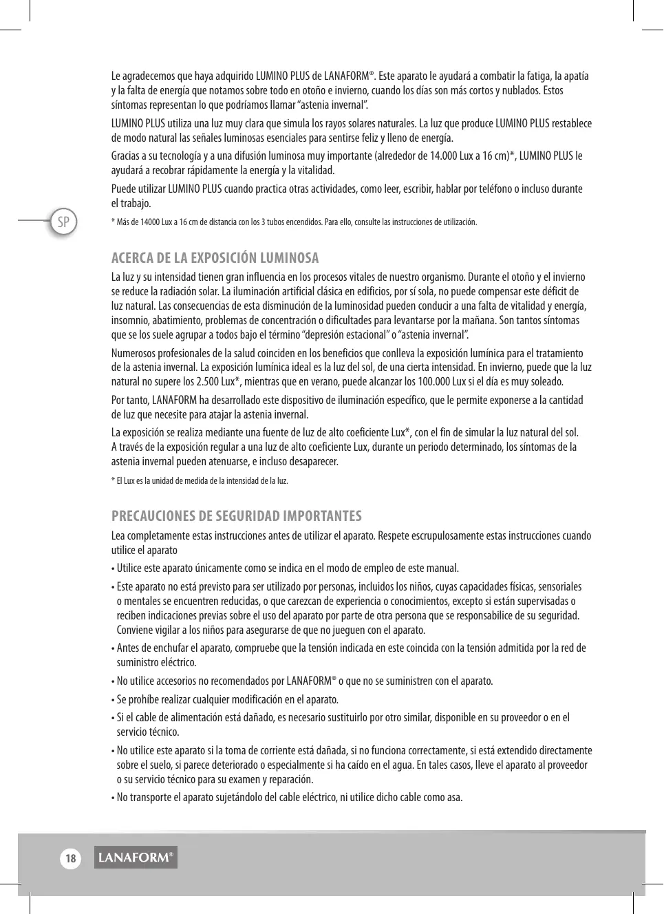 Le agradecemos que haya adquirido LUMINO PLUS de LANAFORM®. Este aparato le ayudará a combatir la fatiga, la apatía y la falta de energía que notamos sobre todo en otoño e invierno, cuando los días son más cortos y nublados. Estos síntomas representan lo que podríamos llamar “astenia invernal”. LUMINO PLUS utiliza una luz muy clara que simula los rayos solares naturales. La luz que produce LUMINO PLUS restablece de modo natural las señales luminosas esenciales para sentirse feliz y lleno de energía. Gracias a su tecnología y a una difusión luminosa muy importante (alrededor de 14.000 Lux a 16 cm)*, LUMINO PLUS le ayudará a recobrar rápidamente la energía y la vitalidad. Puede utilizar LUMINO PLUS cuando practica otras actividades, como leer, escribir, hablar por teléfono o incluso durante el trabajo.