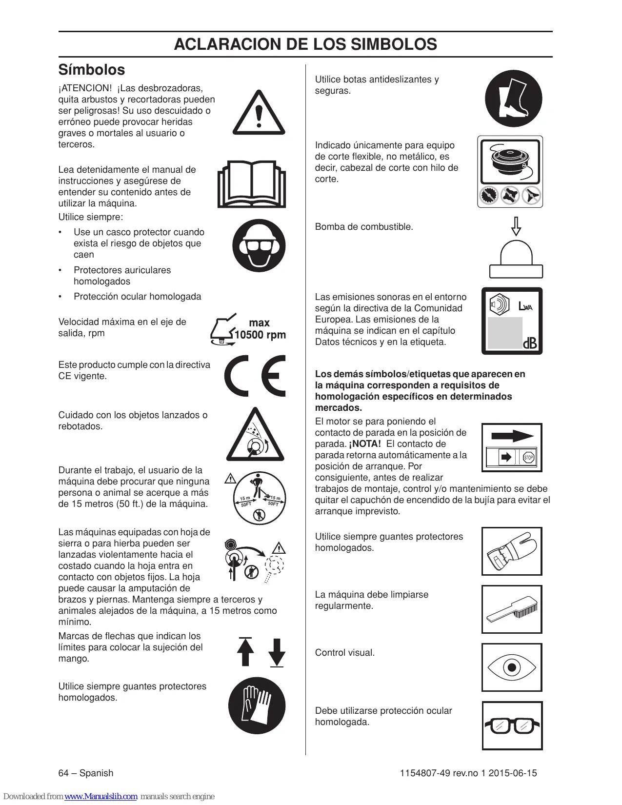Índice ACLARACION DE LOS SIMBOLOS Símbolos INDICE Índice Antes de arrancar, observe lo siguiente: INTRODUCCION Apreciado cliente: ¿QUE ES QUE? ¿Qué es qué en la desbrozadora? INSTRUCCIONES GENERALES DE SEGURIDAD Importante Equipo de protección personal Equipo de seguridad de la máquina Equipo de corte MONTAJE Montaje del manillar Montaje y desmontaje del tubo divisible Montaje del equipo de corte Montaje de la protección de hoja, hoja de hierba y cuchilla de hierba Montaje de la protección de hoja y hoja de sierra Montaje de las demás protecciones y equipos de corte Ajuste del arnés y la desbrozadora Arnés estándar MANIPULACION DEL COMBUSTIBLE Seguridad en el uso del combustible Carburante Repostaje ARRANQUE Y PARADA Control antes de arrancar Arranque y parada TECNICA DE TRABAJO Instrucciones generales de trabajo MANTENIMIENTO Carburador Silenciador Sistema refrigerante Bujía Filtro de aire Programa de mantenimiento DATOS TECNICOS Datos técnicos Declaración CE de conformidad DECLARACIÓN DE GARANTÍA DE CONTROL DE EMISIONES FEDERAL Y CALIFORNIANA SUS DERECHOS Y OBLIGACIONES DE GARANTIA 1154807-49 rev.no 1 2015-06-15 Downloaded from www.Manualslib.com manuals search engine