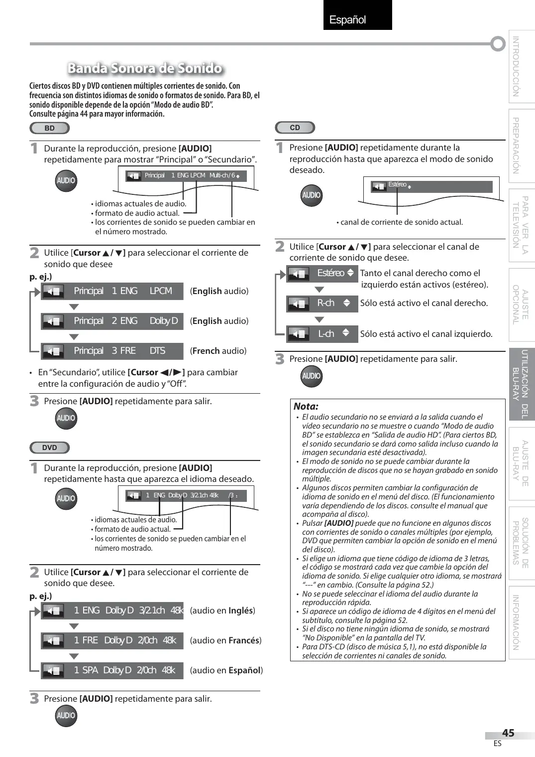 1 Durante la reproducción, presione [AUDIO] reproducción hasta que aparezca el modo de sonido deseado. Estéreo 2 Utilice [Cursor K/ L] para seleccionar el corriente de sonido que desee p. ej.) Principal 2 ENG Dolby D DTS 2 Utilice [Cursor K/ L] para seleccionar el canal de corriente de sonido que desee. Estéreo Tanto el canal derecho como el izquierdo están activos (estéreo). R-ch Sólo está activo el canal derecho. L-ch Sólo está activo el canal izquierdo.