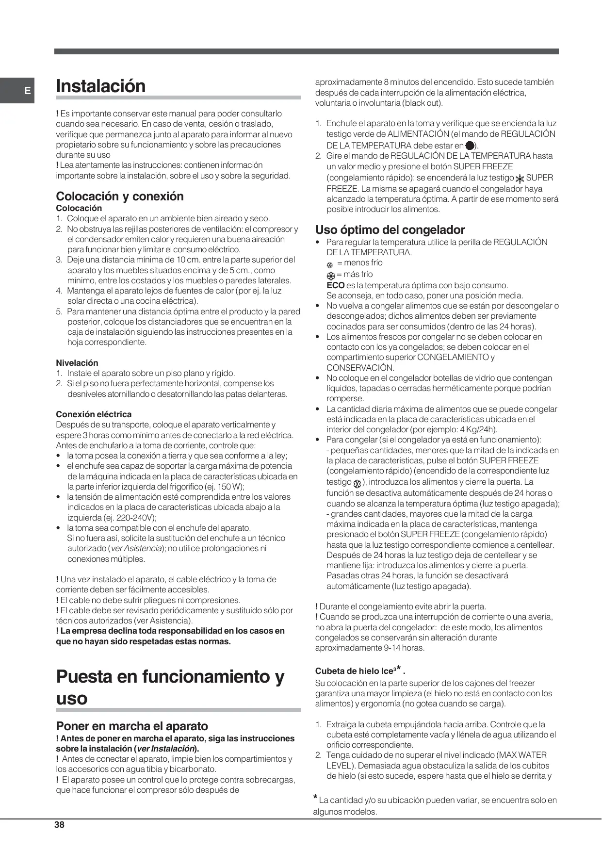 = menos frío = más frío ECO es la temperatura óptima con bajo consumo. Se aconseja, en todo caso, poner una posición media. • No vuelva a congelar alimentos que se están por descongelar o descongelados; dichos alimentos deben ser previamente cocinados para ser consumidos (dentro de las 24 horas). • Los alimentos frescos por congelar no se deben colocar en contacto con los ya congelados; se deben colocar en el compartimiento superior CONGELAMIENTO y CONSERVACIÓN. • No coloque en el congelador botellas de vidrio que contengan líquidos, tapadas o cerradas herméticamente porque podrían romperse. • La cantidad diaria máxima de alimentos que se puede congelar está indicada en la placa de características ubicada en el interior del congelador (por ejemplo: 4 Kg/24h). • Para congelar (si el congelador ya está en funcionamiento): - pequeñas cantidades, menores que la mitad de la indicada en la placa de características, pulse el botón SUPER FREEZE (congelamiento rápido) (encendido de la correspondiente luz testigo ), introduzca los alimentos y cierre la puerta. La función se desactiva automáticamente después de 24 horas o cuando se alcanza la temperatura óptima (luz testigo apagada); - grandes cantidades, mayores que la mitad de la carga máxima indicada en la placa de características, mantenga presionado el botón SUPER FREEZE (congelamiento rápido) hasta que la luz testigo correspondiente comience a centellear. Después de 24 horas la luz testigo deja de centellear y se mantiene fija: introduzca los alimentos y cierre la puerta. Pasadas otras 24 horas, la función se desactivará automáticamente (luz testigo apagada). ! Durante el congelamiento evite abrir la puerta. ! Cuando se produzca una interrupción de corriente o una avería, no abra la puerta del congelador: de este modo, los alimentos congelados se conservarán sin alteración durante aproximadamente 9-14 horas.